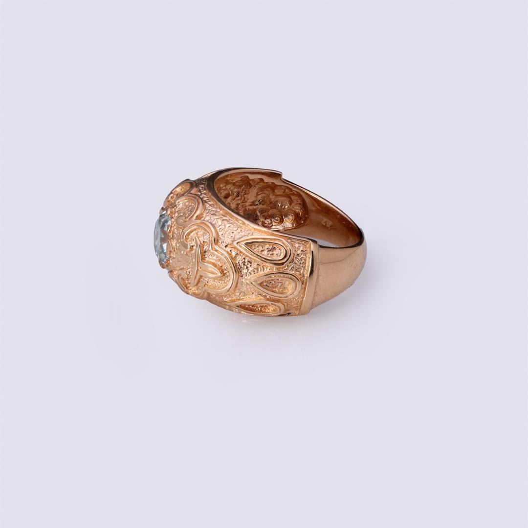 14k rose gold ring; the exterior of the ring deeply engraved with designs in high relief and set with round cut moissanite with a hint of light blue coloring, marked 14k to interior; gross weight 8.1 g, size 6 3/4