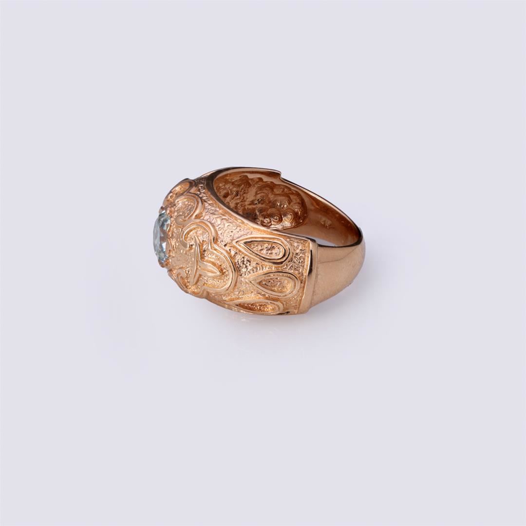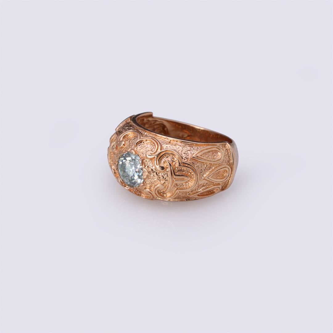 14K Rose Gold & Moissanite Ring containing one round light blue moissanite weighing approximately 1.0 cts. Total weight of ring is 8.2 gm. Estimated retail value $2,500.