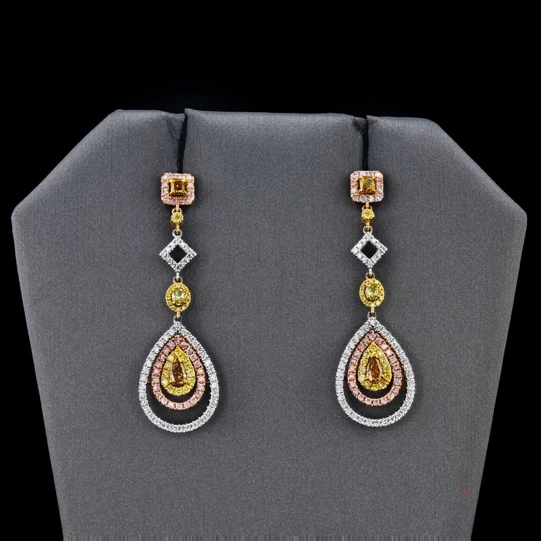 14K Rose, White and Yellow Gold Diamond Dangle Earrings. Please see Photos and Description for all available information. Fashioned in 14K yellow, white and rose gold, this one and three quarter inch length diamond earrings features a total of one and three quarter carats of diamonds. The earrings are accented with 92 prong set round brilliant cut diamonds, 44 prong set round oval and radiant cut diamonds, and 54 prong set pear shaped cut diamonds. The earrings are secured with post and push back closures.