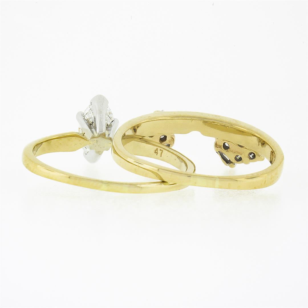 A solid 14k yellow & white gold engagement wedding ring set. with 1 marquise cut natural diamond (G - SI2 ; 4.1x7.25mm - 0.40ct), and 8 round brilliant cut natural diamonds ( G/H - SI1/SI2 ; 0.20ctw), with 4 baguette cut natural diamonds ( G/H - VS2/SI1 ; 0.10ctw). The ring is size 6.0, weighs a total of 4.18 grams, and measures 8.10mm wide.
