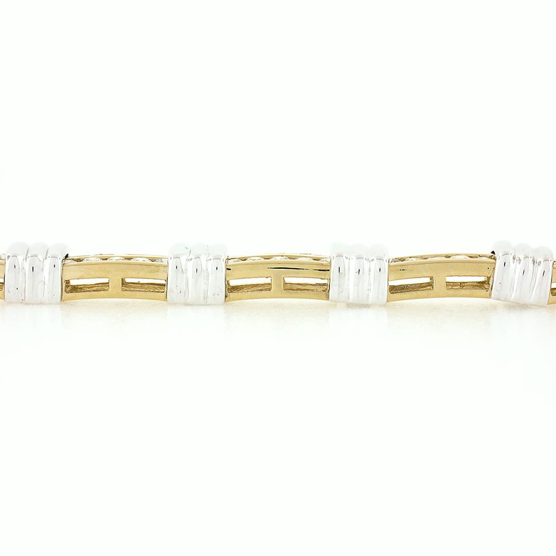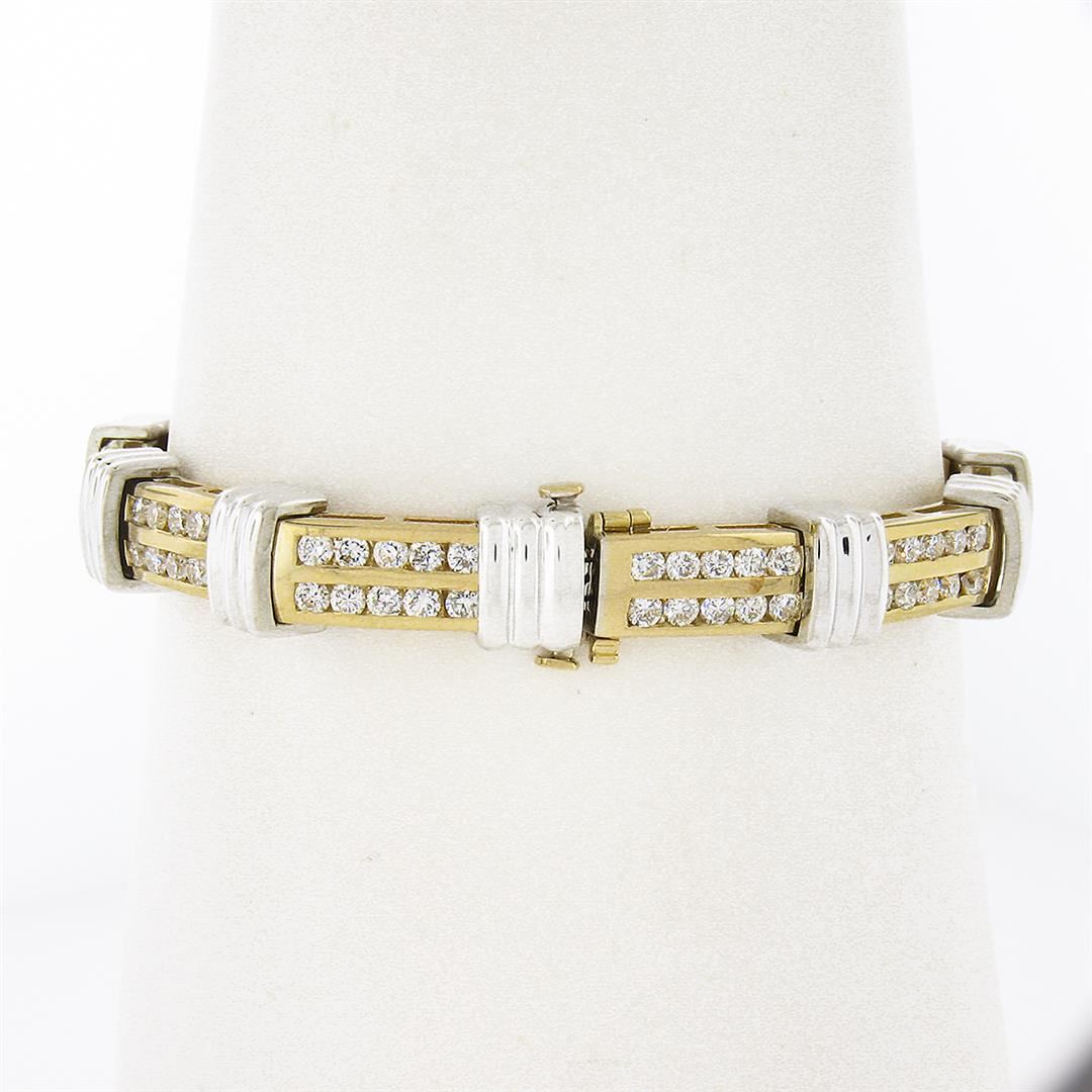 A new solid 14k yellow and white gold tennis link bracelet, with 110 round brilliant cut natural diamonds (G/H - VS1/VS2 ; 3.50ctw). It weighs a total of 38.18 grams, measures 9.1mm wide, and measures 7 inches in length.
