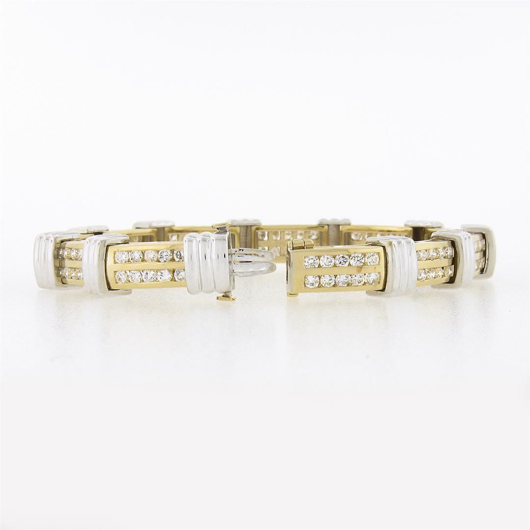 A new solid 14k yellow and white gold tennis link bracelet, with 110 round brilliant cut natural diamonds (G/H - VS1/VS2 ; 3.50ctw). It weighs a total of 38.18 grams, measures 9.1mm wide, and measures 7 inches in length.