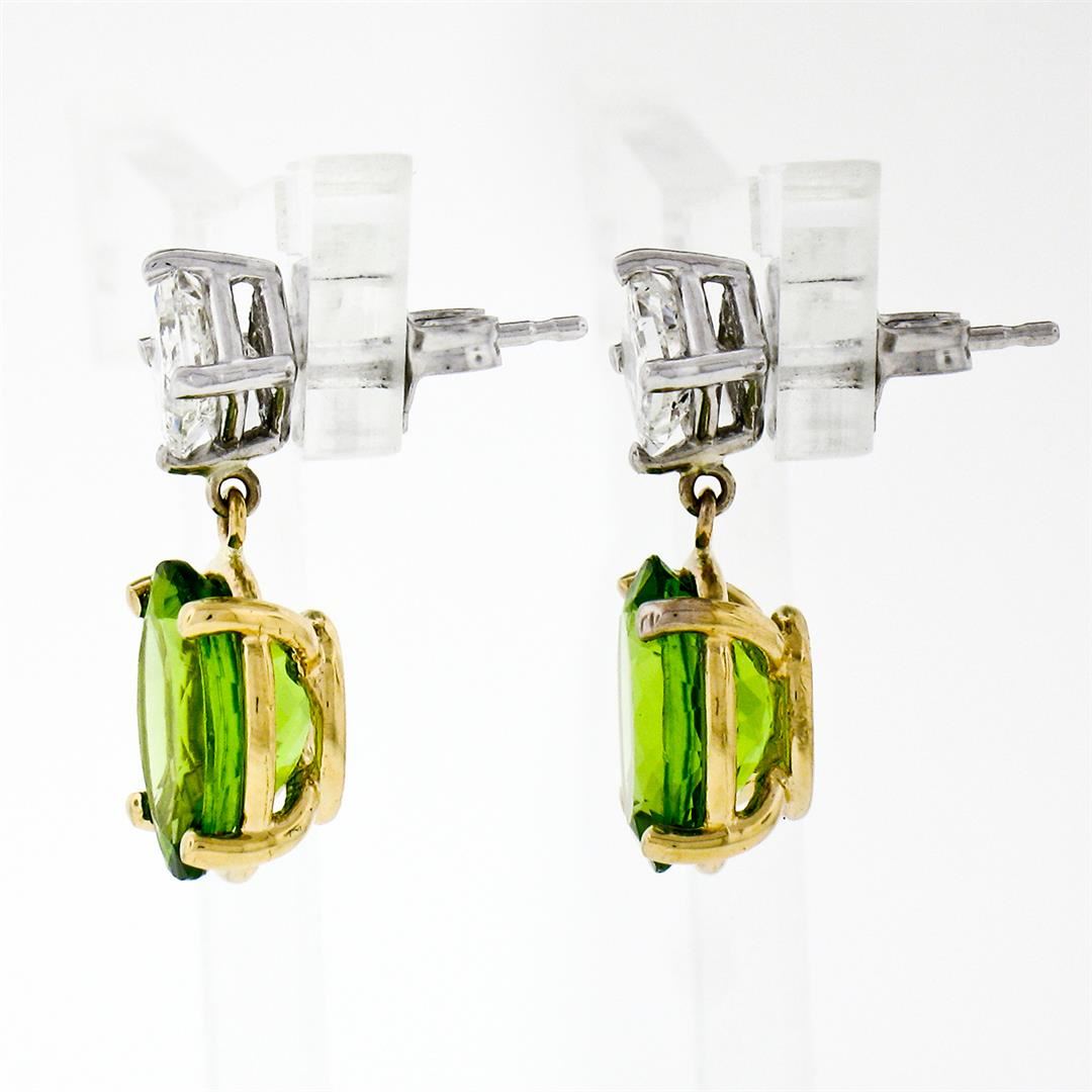 A new solid 14k yellow and white gold drop dangle earrings, with 2 oval brilliant cut natural peridots ( 7.80x9.80mm - 4.70ctw), and 2 princess cut natural diamonds (G- VS1/VS2; 1.00ctw). The earrings measure approximately 19.60x8.0mm and weigh a total of 3.64 grams.
