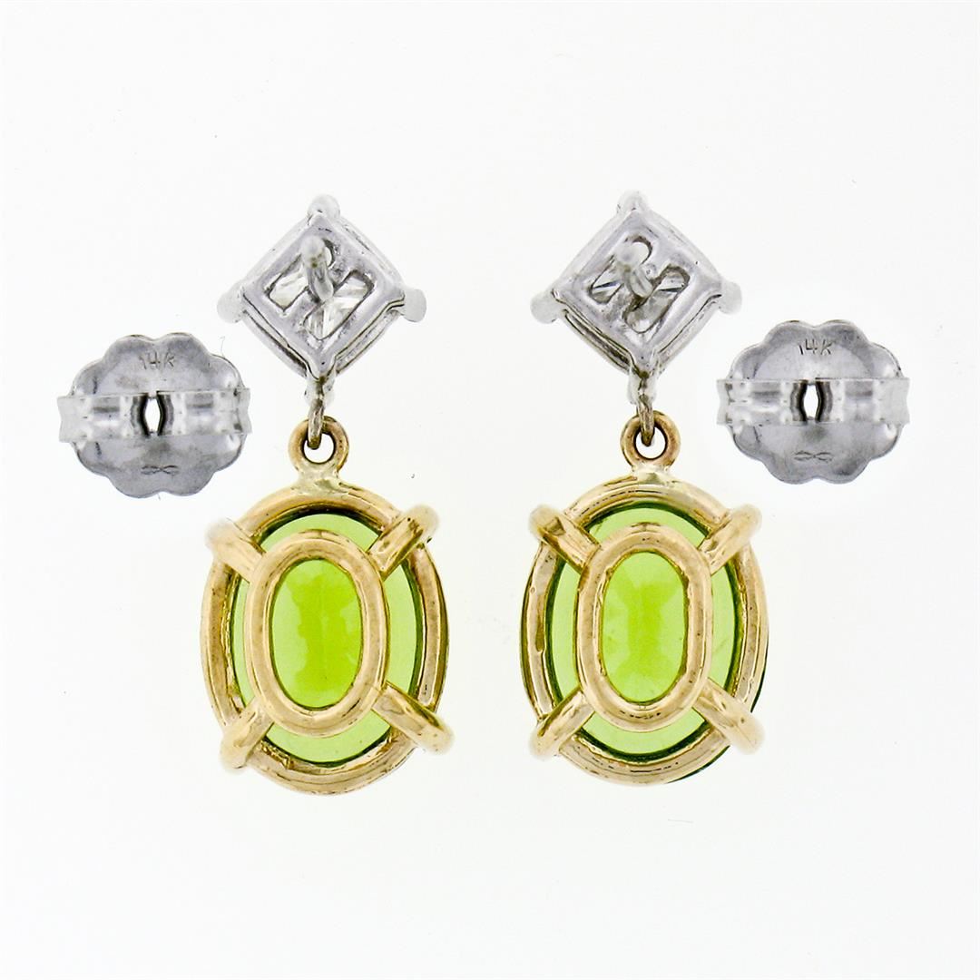 A new solid 14k yellow and white gold drop dangle earrings, with 2 oval brilliant cut natural peridots ( 7.80x9.80mm - 4.70ctw), and 2 princess cut natural diamonds (G- VS1/VS2; 1.00ctw). The earrings measure approximately 19.60x8.0mm and weigh a total of 3.64 grams.