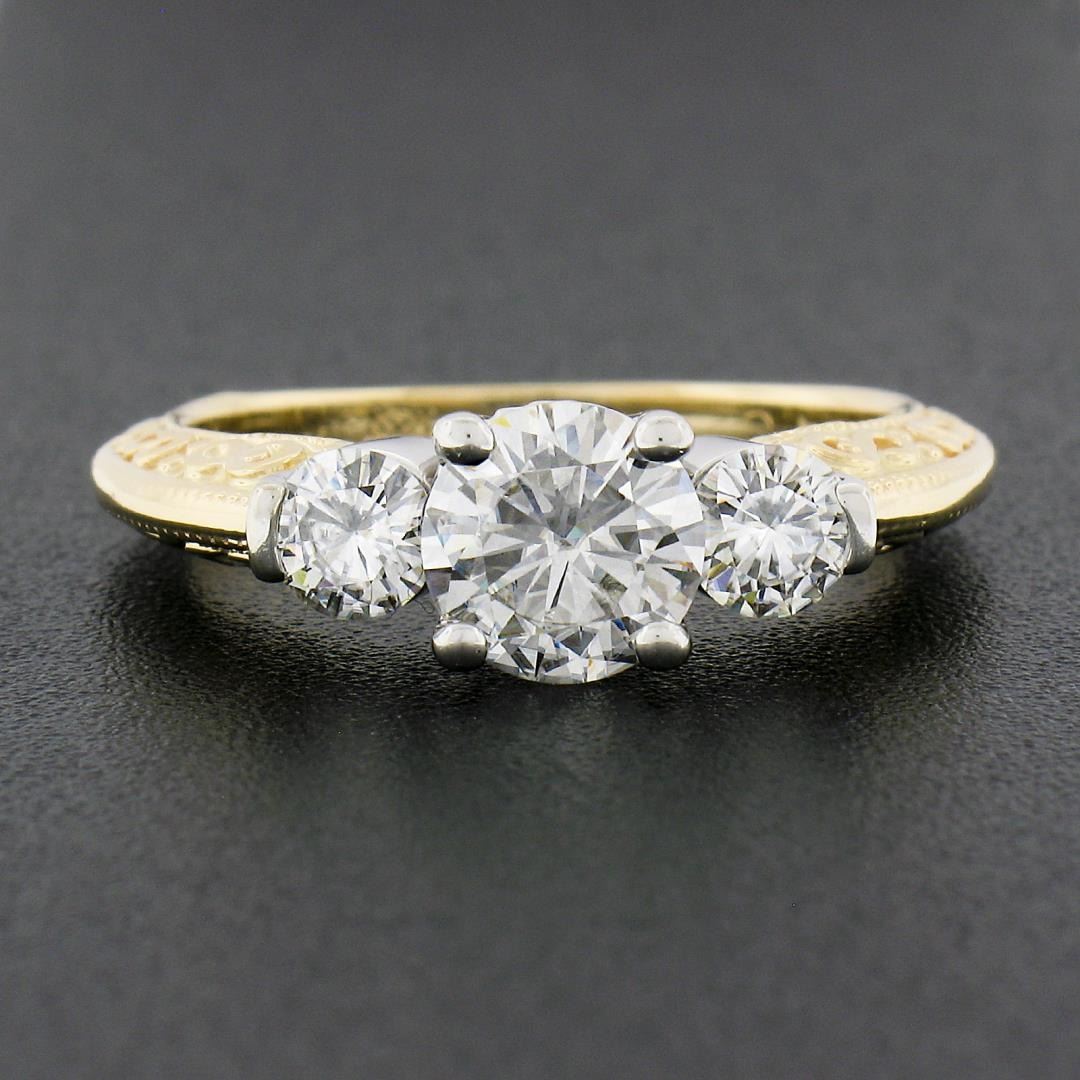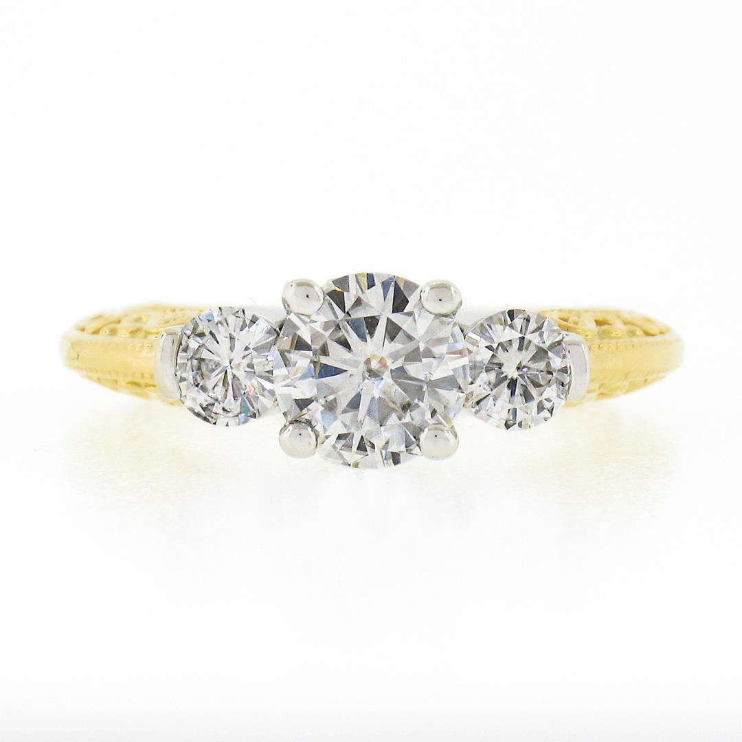 A solid 14k yellow & white gold ring, with 4 round cut synthetic moissanites. The ring is size 7.0, weighs a total of 4.81 grams, and measures 6.6mm wide.