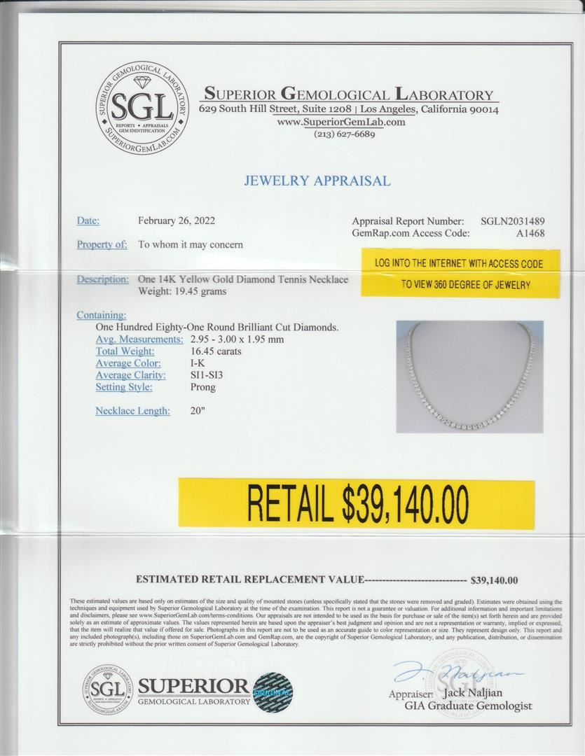 14K Tennis Necklace 16.45cts of Diamonds. Please see Photos and Description for all available information. This is a necklace of diamonds set in a 14K yellow gold chain. It is 20 inches long and weighs 19.45 grams. It has a total of 16.45cts of diamonds.