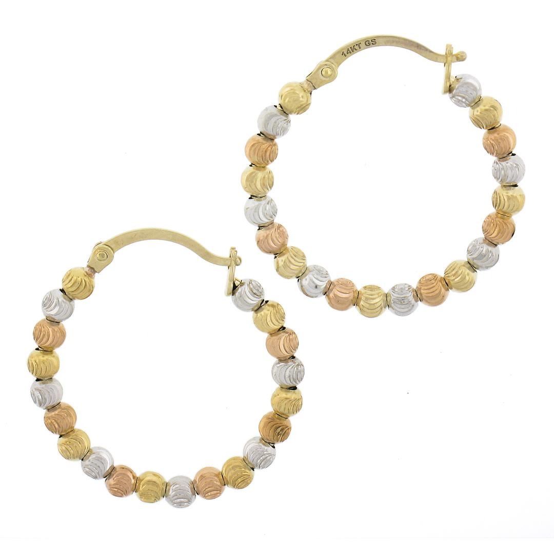 A solid 14k yellow, rose & white gold hoop earrings. The earrings measure approximately 25x3mm and weigh a total of 3.79 grams.