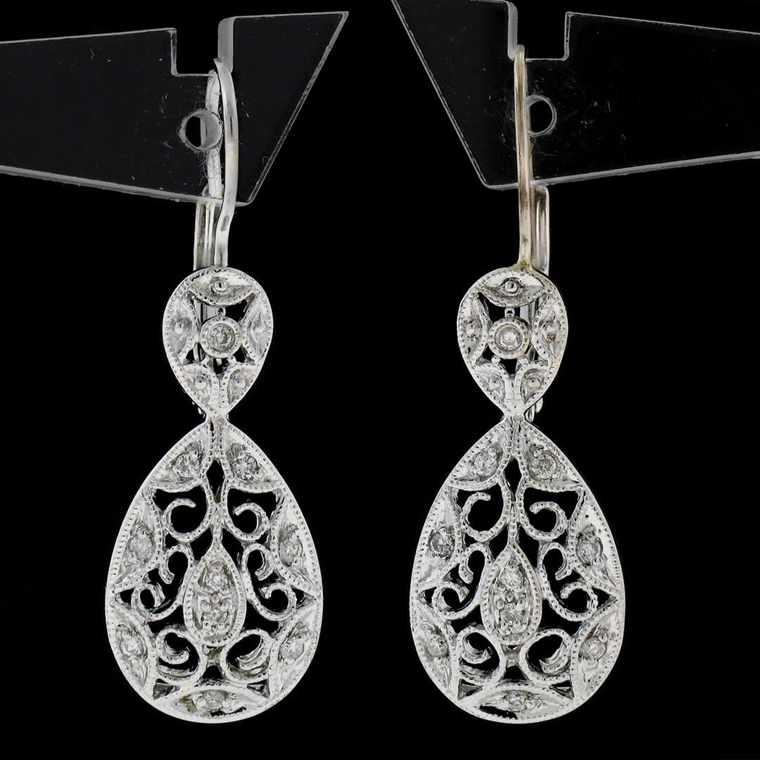 A new solid 14k white gold teradrop dangle earrings, featuring 18 round brilliant cut natural diamonds (H/I - VS2; 0.10ctw). The earrings measure approximately 32.60x10.50mm and weigh a total of 3.85 grams.