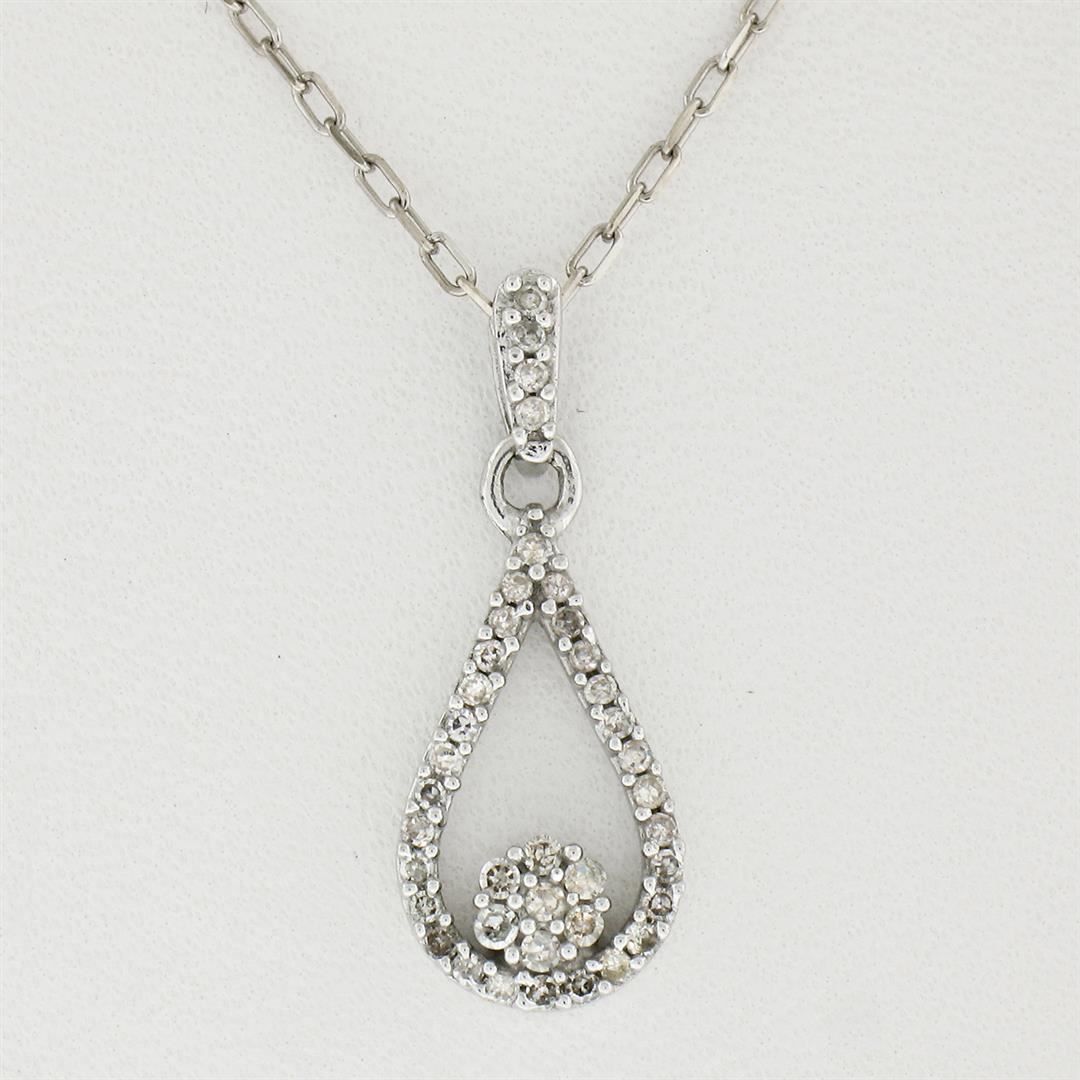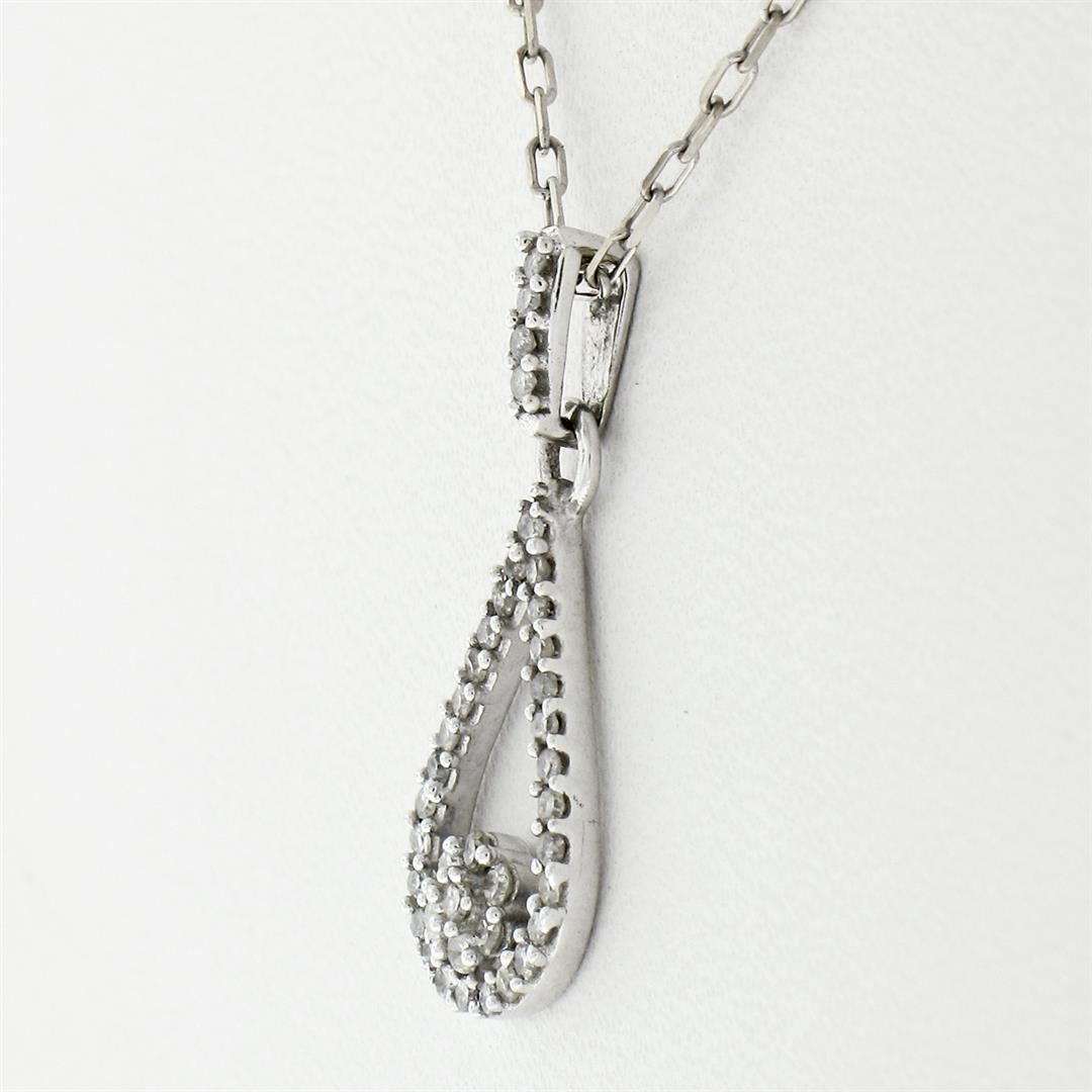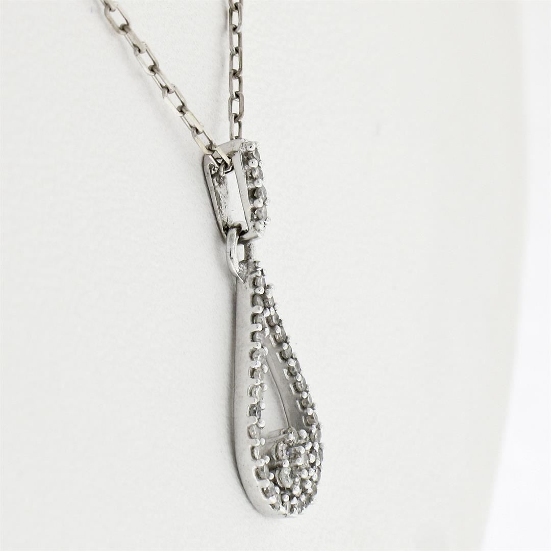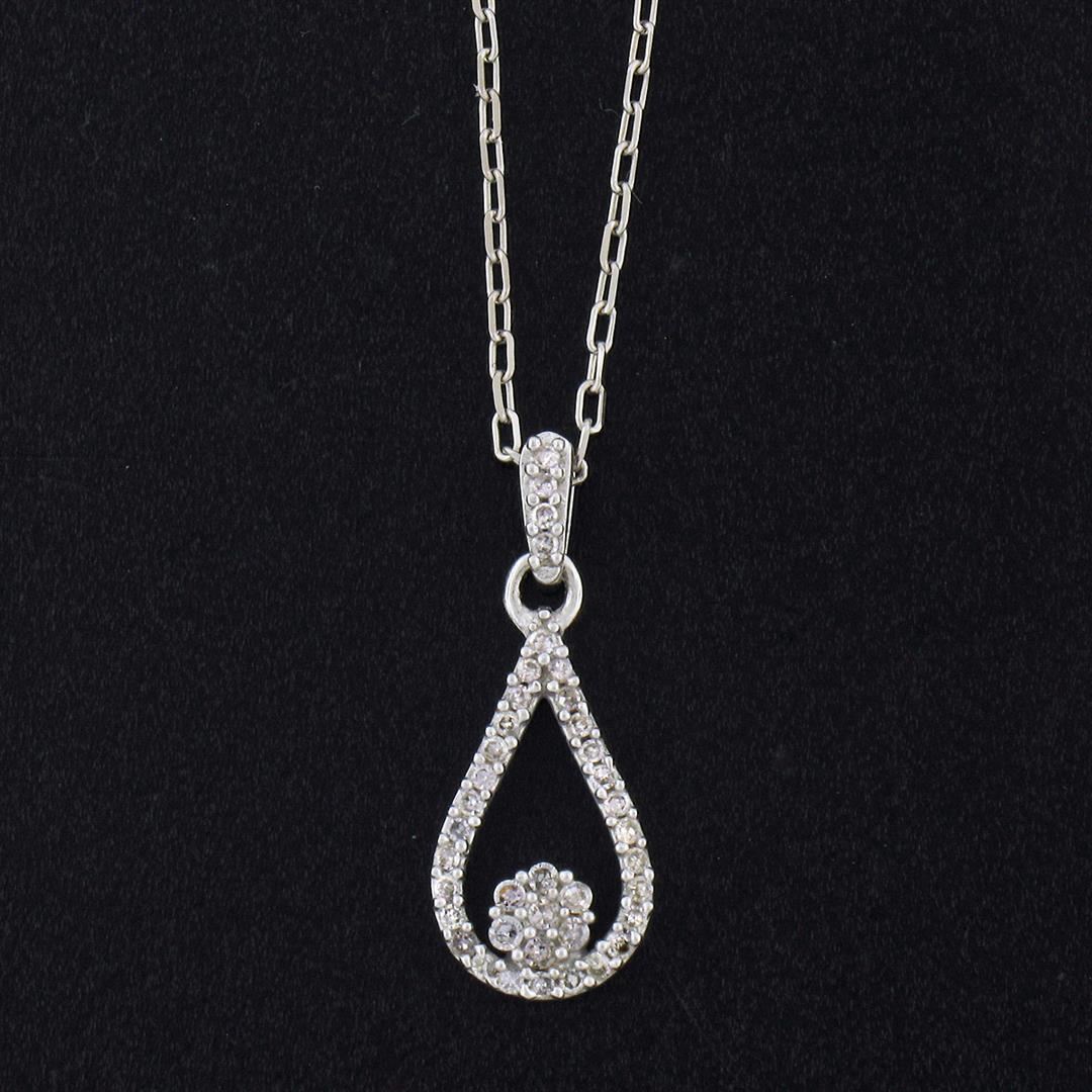14K White Gold 0.12ctw Single Cut Diamond Petite Open Tear Drop Pendant Necklace. A solid 14k white gold open tear drop pendant featuring 39 round single cut natural diamonds (H/I - SI2/I1; 0.12ctw). 16 inch fine cable link chain, 1.88 grams total weight,