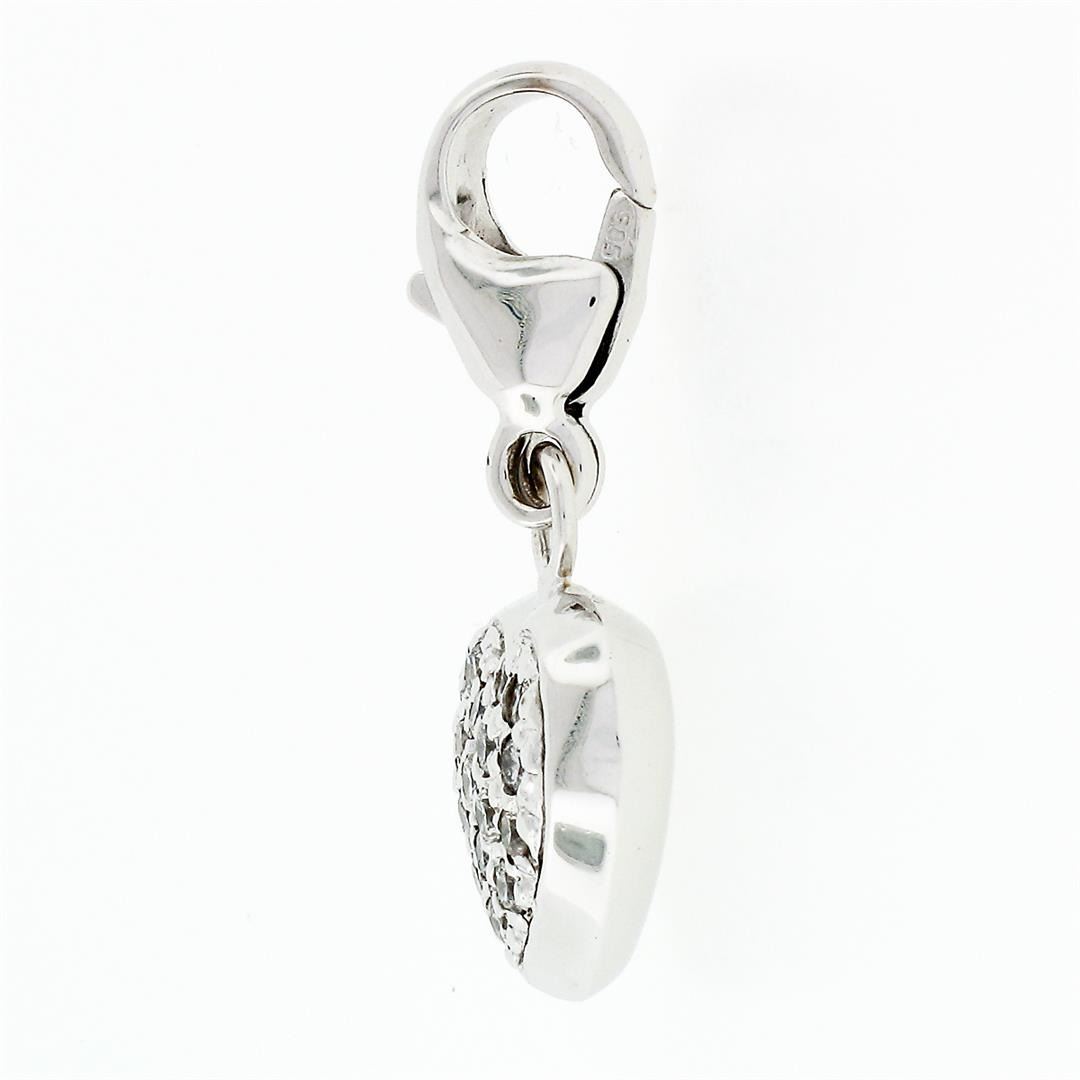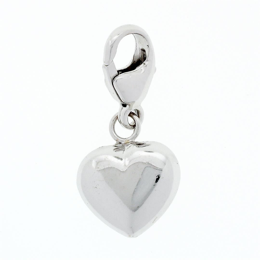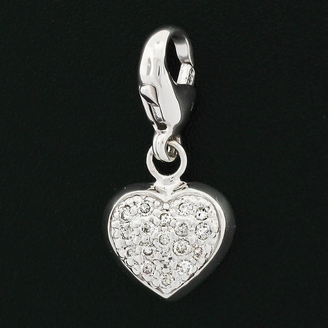 A solid 14k white gold puffed heart dangle charm Pendant, with 18 round brilliant cur natural diamonds (G/H - VS2/SI1; 0.25ctw). The pendant weighs a total of 3.09 grams, measures 23.7x11.1mm including the bail, and the inside of the bail measures 3.7mm