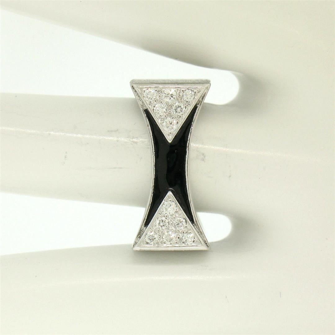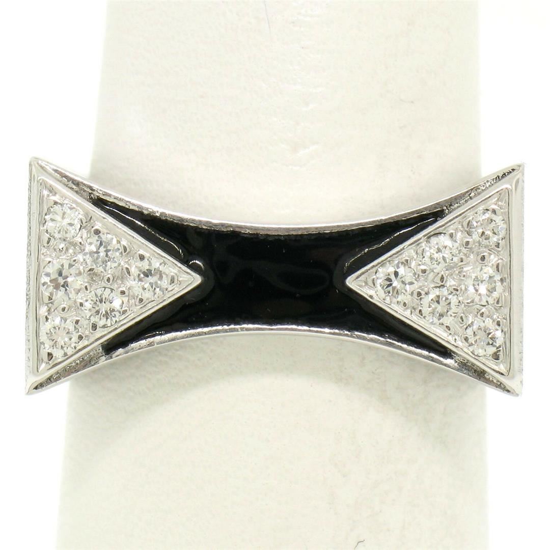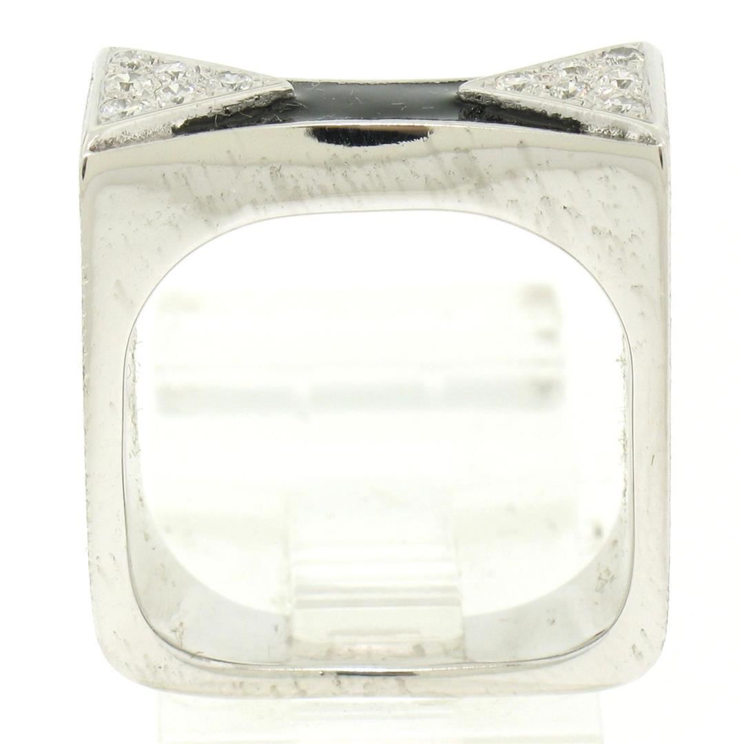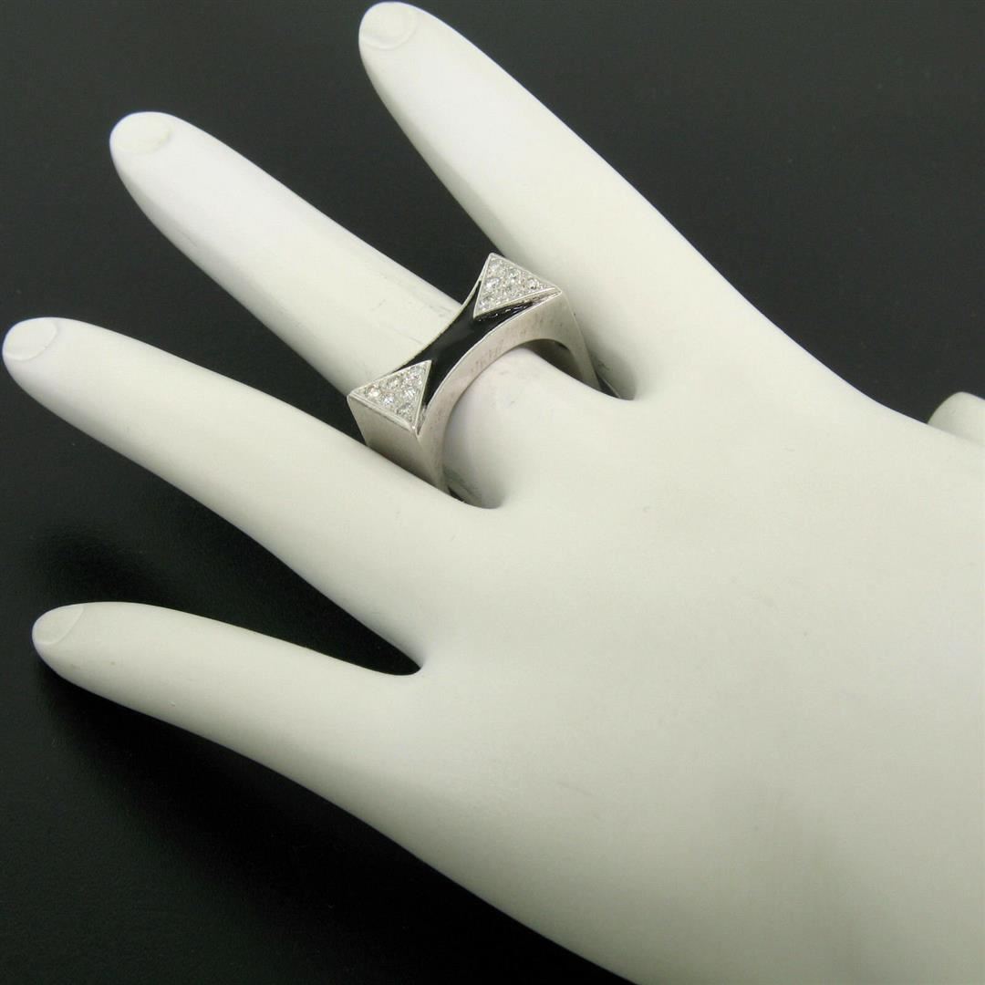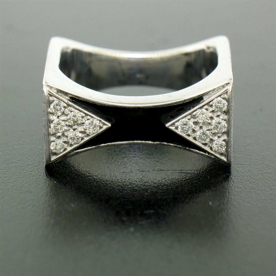One 14K White Gold 0.30ctw Diamond & Black Enamel Stone Finished Squared Band Ring. Item Details: Material: 14k Solid White Gold, Weight: 11.9 Grams, Stone(s): (12) Natural Genuine Diamonds - Round Brilliant Cut - Prong Set - F Color - VS1 Clarity, Total Carat Weight: 0.30 (approx.), Ring Size: 7.0, Ring Width: 9.5mm, Ring Height: 3.5mm rise off the finger, Condition: Like New!