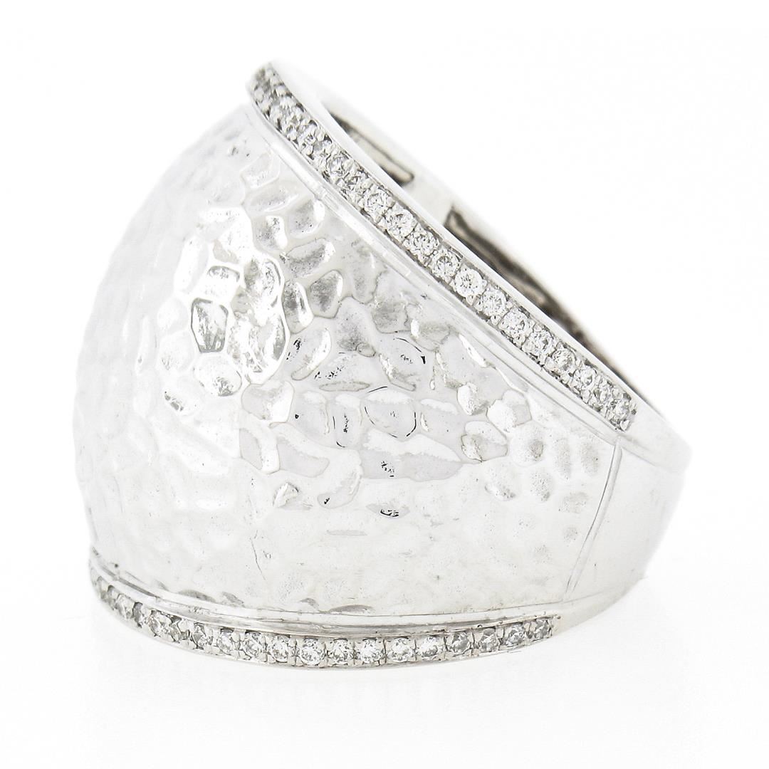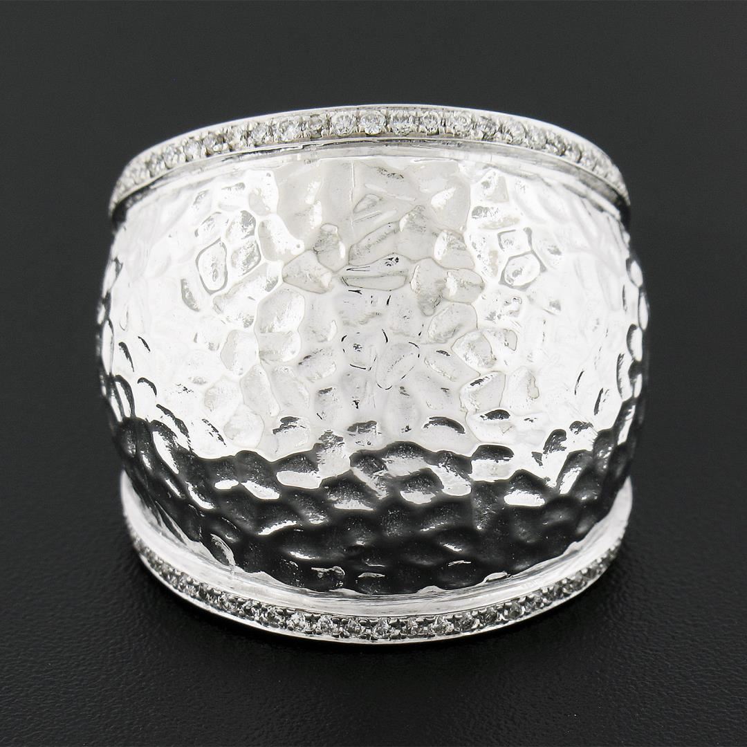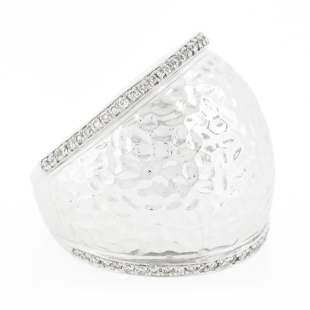 A solid 14k white gold wide hammered finish band ring, with 78 round brilliant cut natural diamonds (G/H - VS1/VS2 ; 0.39ctw). The ring is size 7.5, weighs a total of 16.17 grams, and measures 23.1mm wide.
