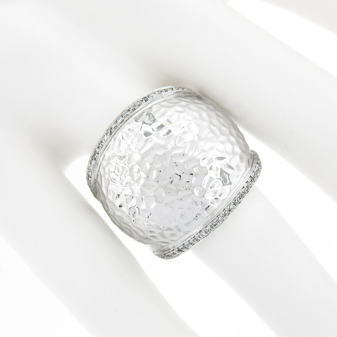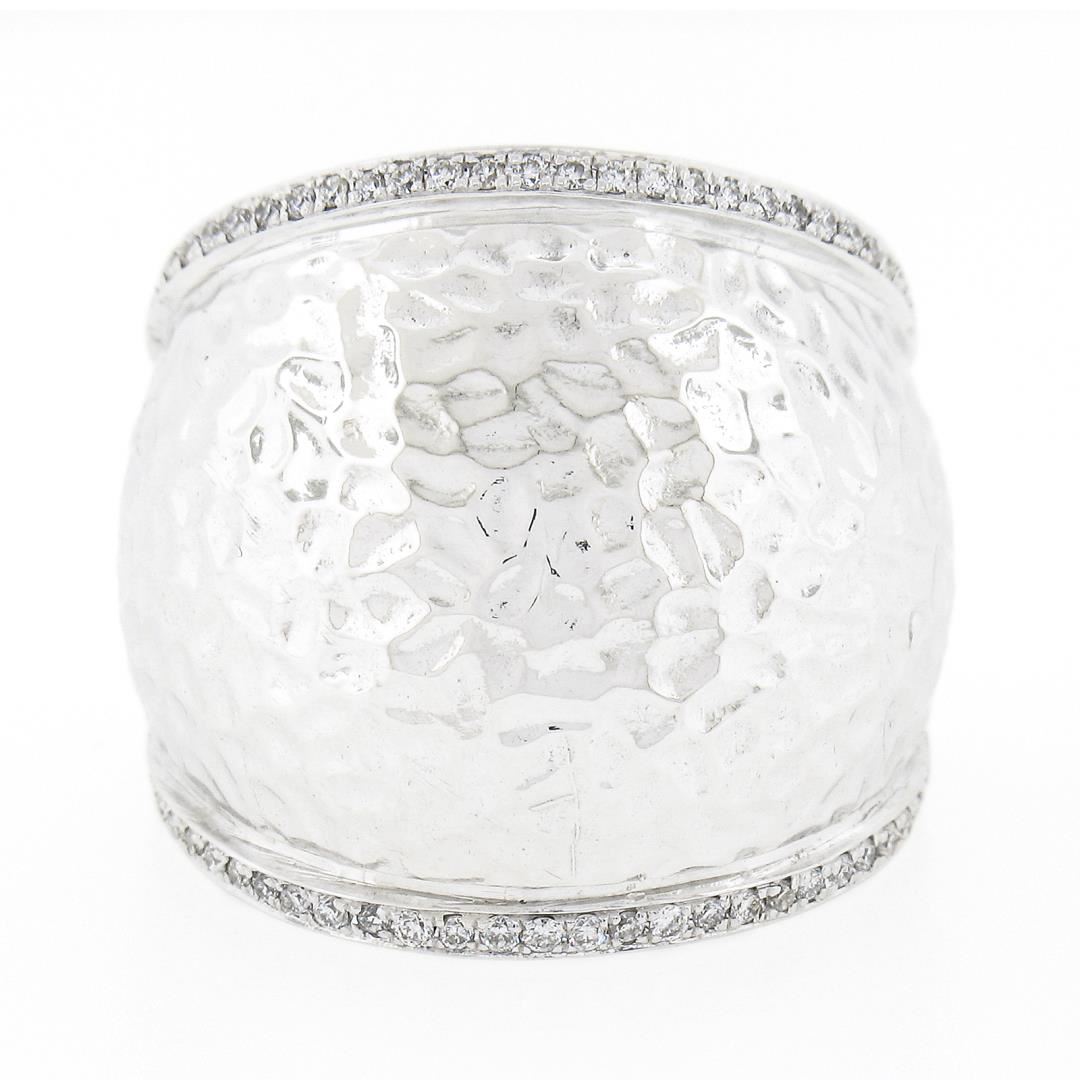 A solid 14k white gold wide hammered finish band ring, with 78 round brilliant cut natural diamonds (G/H - VS1/VS2 ; 0.39ctw). The ring is size 7.5, weighs a total of 16.17 grams, and measures 23.1mm wide.