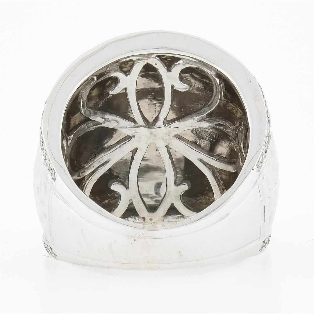 A solid 14k white gold wide hammered finish band ring, with 78 round brilliant cut natural diamonds (G/H - VS1/VS2 ; 0.39ctw). The ring is size 7.5, weighs a total of 16.17 grams, and measures 23.1mm wide.