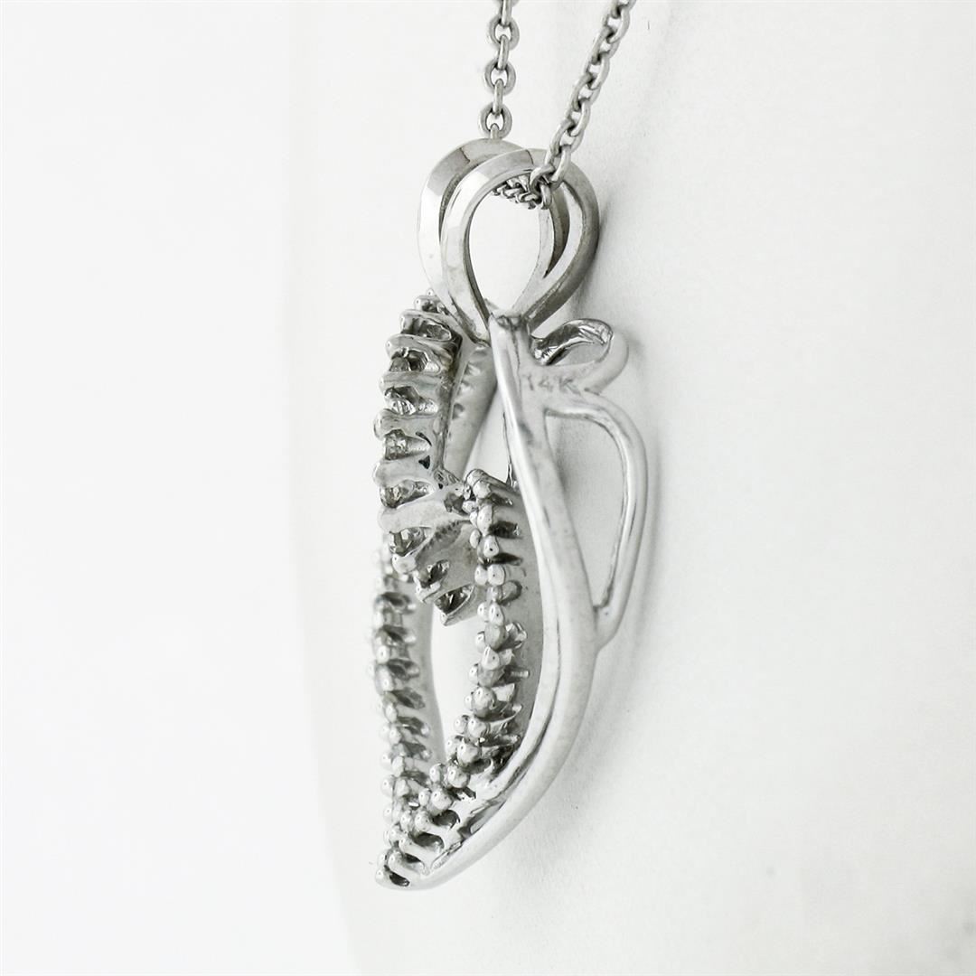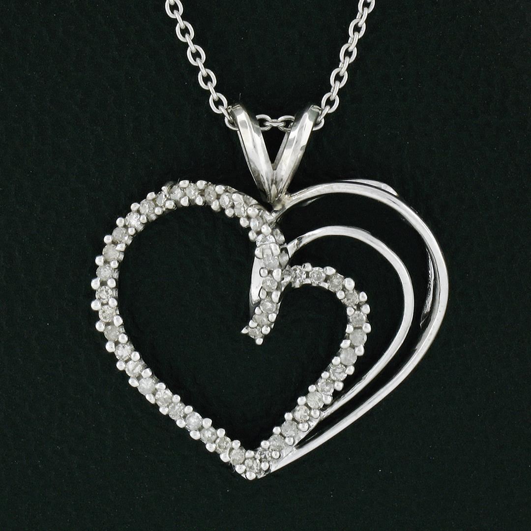 An estate solid 14k white gold heart pendant necklace, with 45 round single cut natural diamonds (H/I - I1/I2; 0.50ctw). The pendant weighs a total of 4.59 grams, measures 24x22.65mm including the bail, and 20 inch fine cable link chain.
