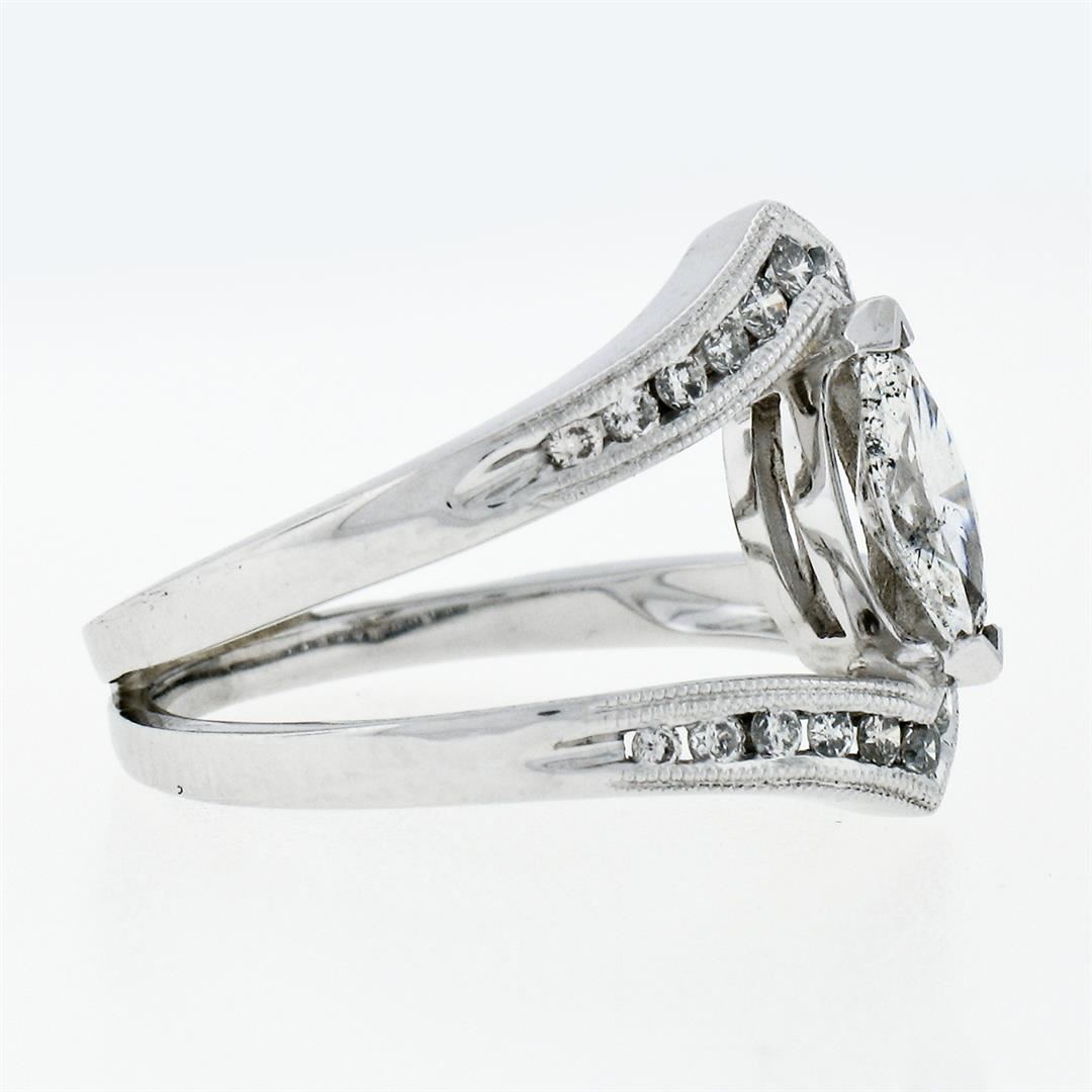A new solid 14k white gold wide open split ring, with 1 marquise cut natural diamond (G- SI2; 0.55ct), and 22 round brilliant cut natural diamonds (G/H - SI1/SI2; 0.46ctw). The ring is size 6.5, weighs a total of 4.91 grams, and measures 15.50mm wide.