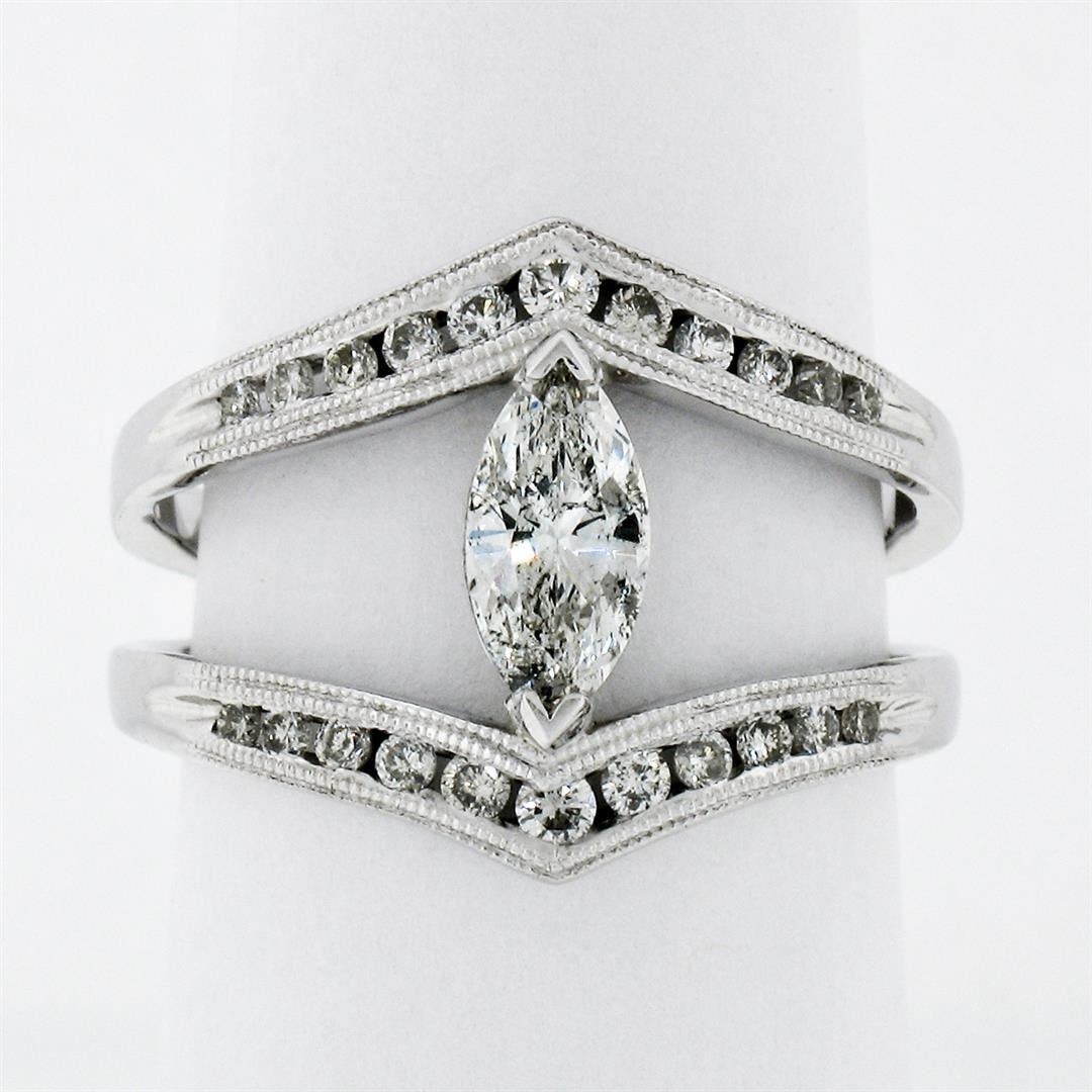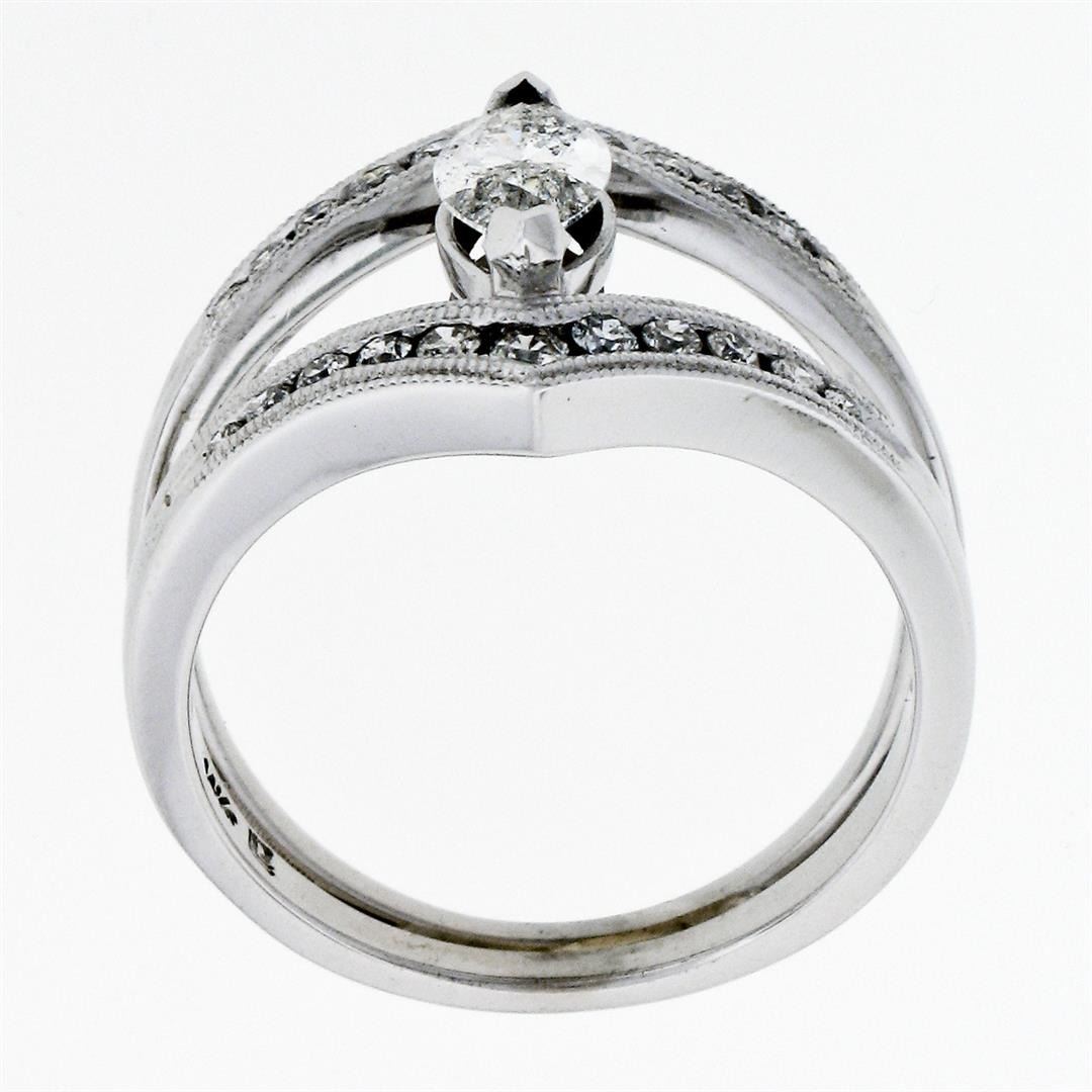 A new solid 14k white gold wide open split ring, with 1 marquise cut natural diamond (G- SI2; 0.55ct), and 22 round brilliant cut natural diamonds (G/H - SI1/SI2; 0.46ctw). The ring is size 6.5, weighs a total of 4.91 grams, and measures 15.50mm wide.