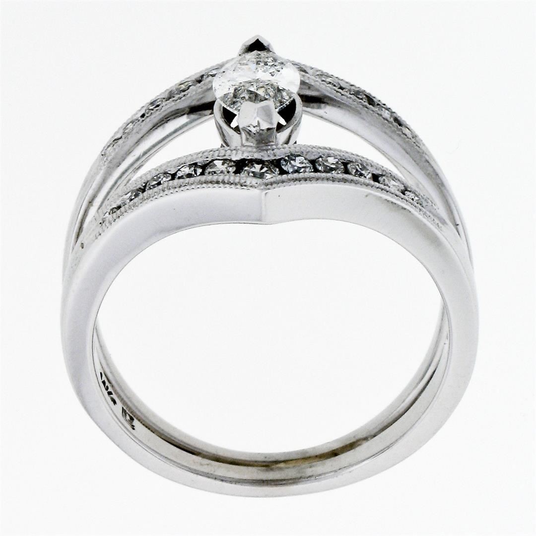 A new solid 14k white gold wide open split ring, with 1 marquise cut natural diamond (G- SI2; 0.55ct), and 22 round brilliant cut natural diamonds (G/H - SI1/SI2; 0.46ctw). The ring is size 6.5, weighs a total of 4.91 grams, and measures 15.50mm wide.