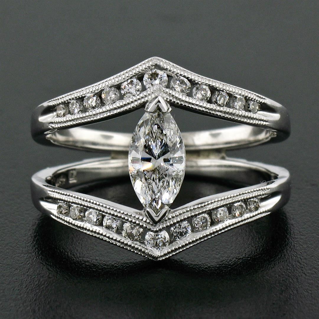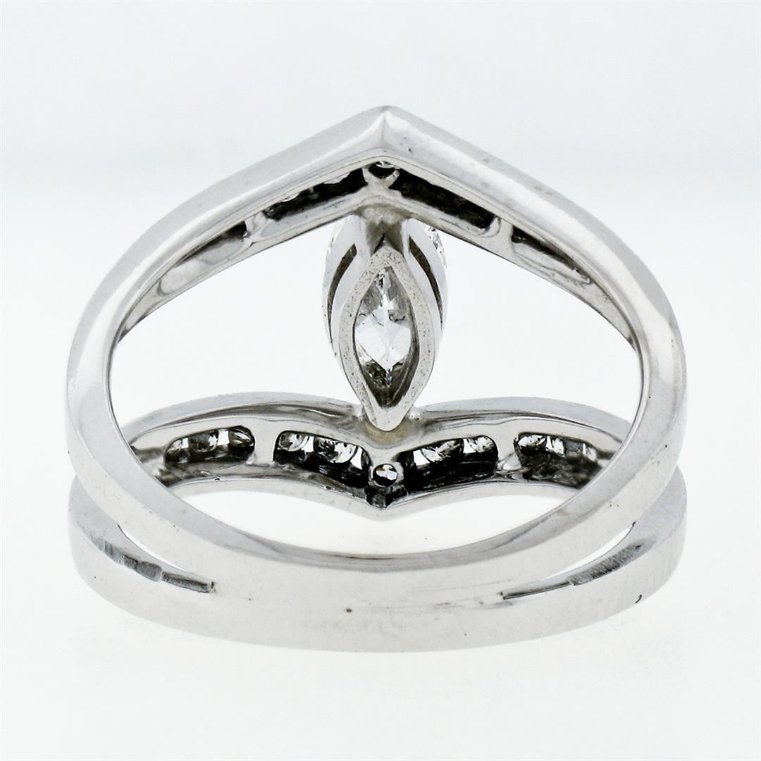 A new solid 14k white gold wide open split ring, with 1 marquise cut natural diamond (G- SI2; 0.55ct), and 22 round brilliant cut natural diamonds (G/H - SI1/SI2; 0.46ctw). The ring is size 6.5, weighs a total of 4.91 grams, and measures 15.50mm wide.