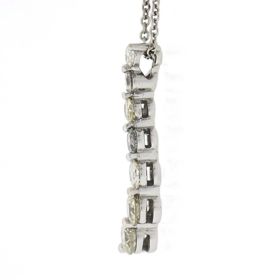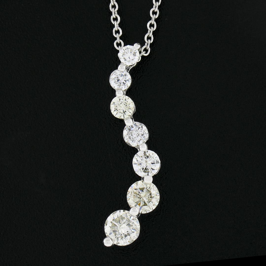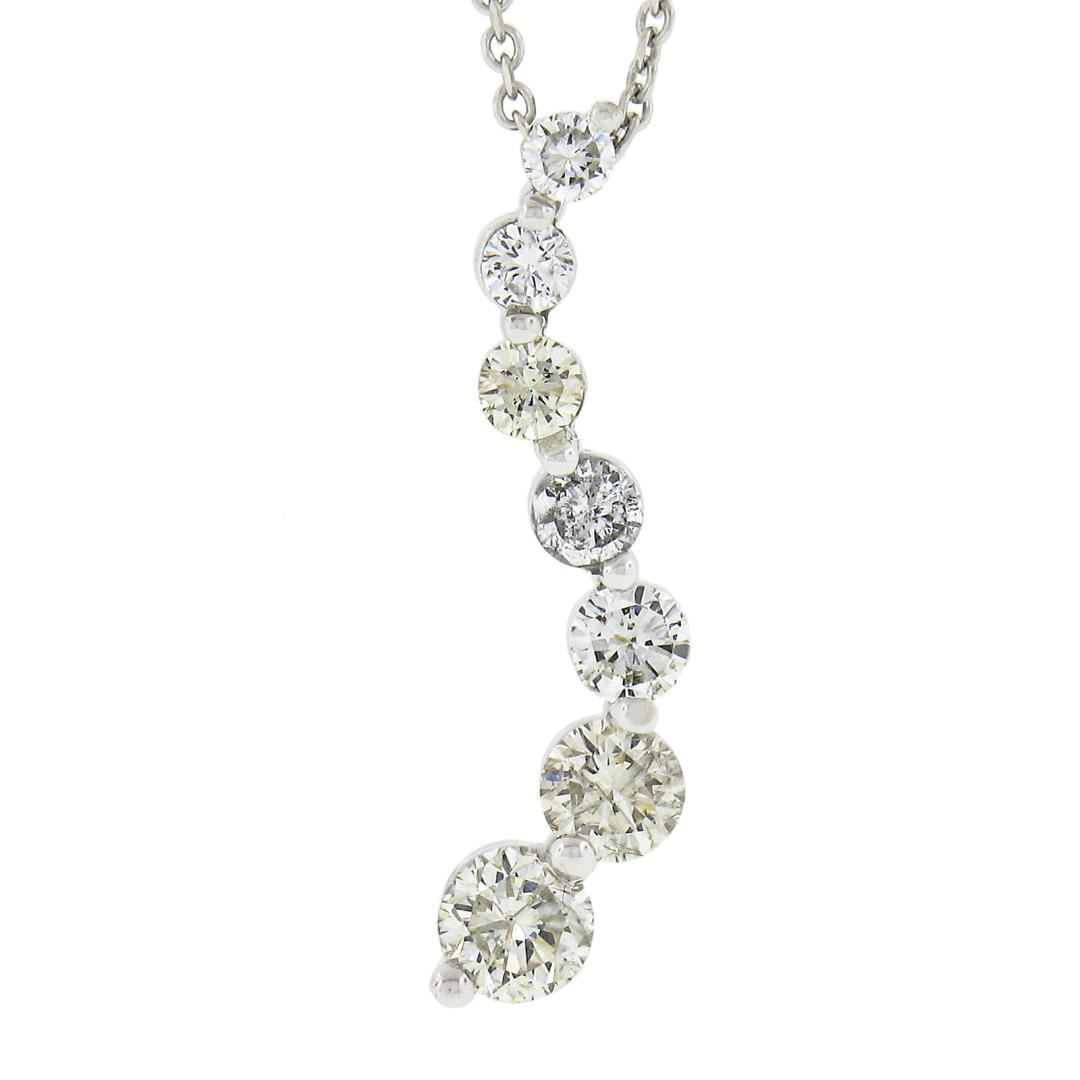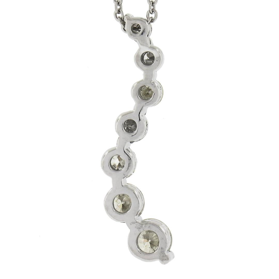 A solid 14k white gold wavy journey pendant necklace, with 7 round cut natural diamonds (G-N - SI1-I1 ; 1.10ctw). 18 inch cable link chain, 3.14 grams total weight, pendant measures 25.2x4.3mm.