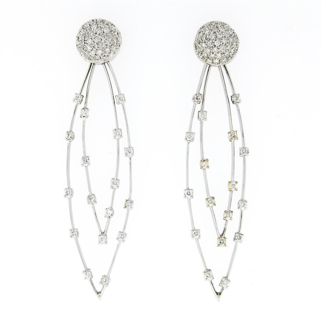 An estate solid 14k white gold swing dangle earrings, with 105 round brilliant cut natural diamonds (F/G - VS1/VS2; 1.30ctw). The earrings measure approximately 68.35x17mm and weigh a total of 14.73 grams.