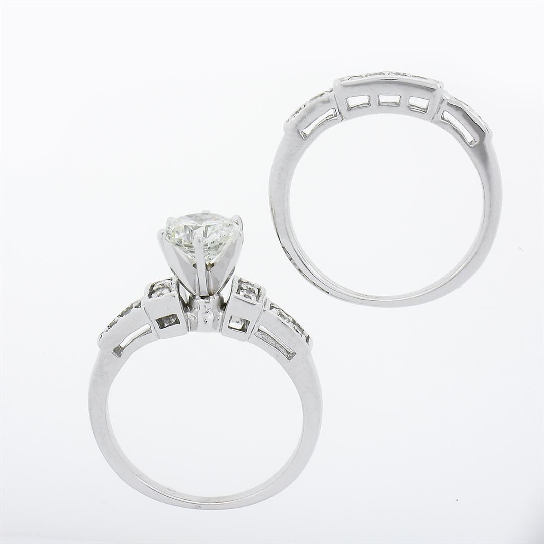 A solid 14k white gold engagement ring and wedding band set, with 1 round brilliant cut natural diamond (H - I1 ; 1.08ct), and 16 round brilliant cut natural diamonds (G/H - SI1/SI2 ; 0.30ctw). The ring is size 4.5, weighs a total of 4.80 grams, and measures 7.60mm wide.