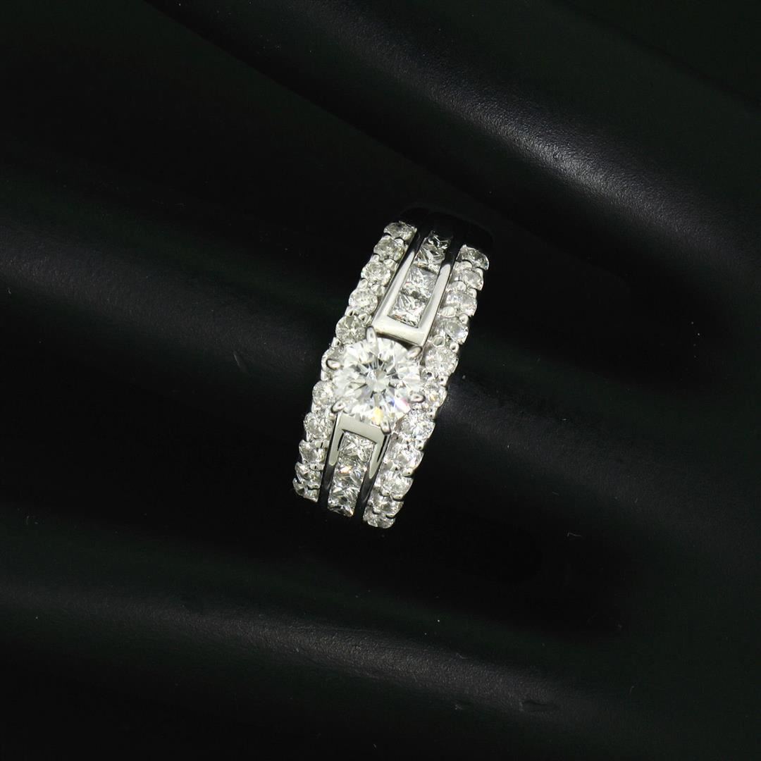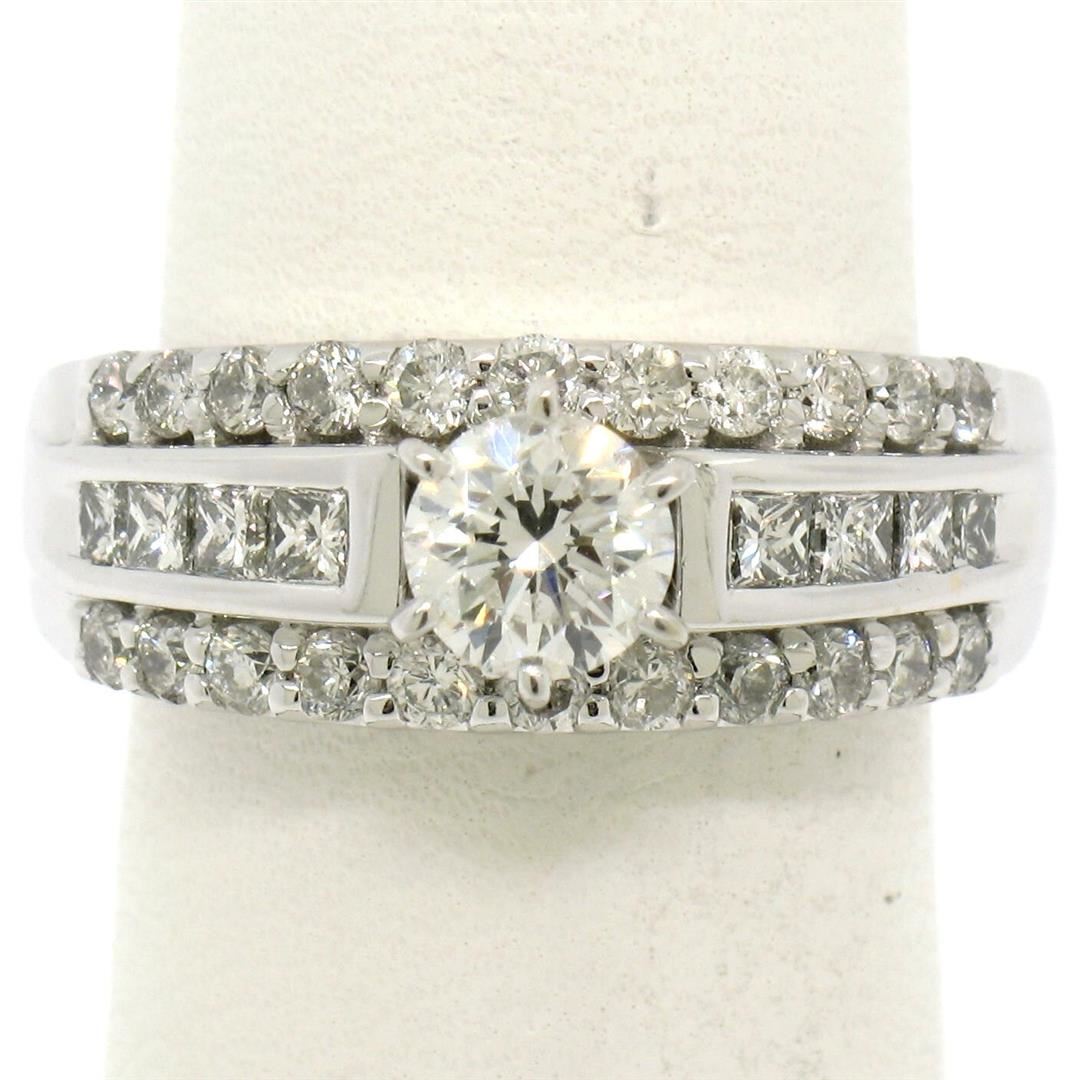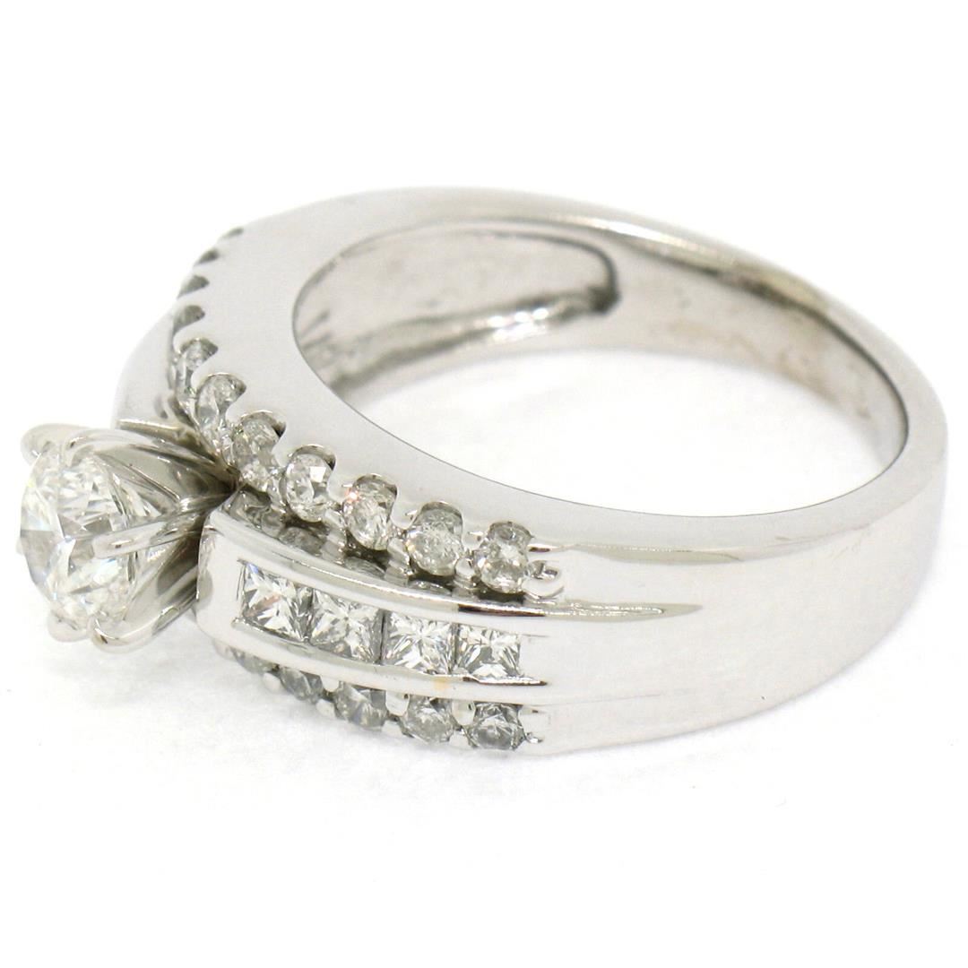 An estate solid 14k white gold solitaire engagement ring, with 1 round brilliant cut natural diamond (G - VS2 ; 0.56ct), accented with 8 princess cut natural diamonds (G - VS2 ; 0.28ctw), and 22 round brilliant cut natural diamonds (G/H - VS2/SI1; 0.55ctw