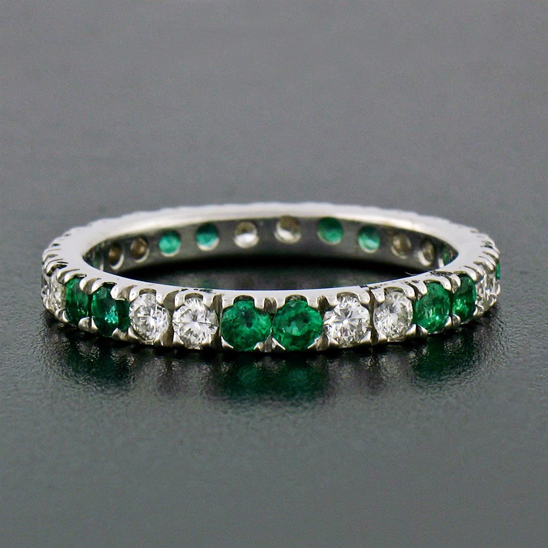 A new solid 14k white gold eternity ban ring, with 14 round brilliant cut natural diamonds (G/H- VS1/VS2; 0.60ctw), and 14 round brilliant cut emerlads (0.80ctw). The ring is size 7.0, weighs a total of 2.24 grams, and measures 2.65mm wide.