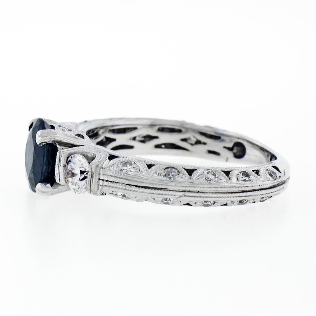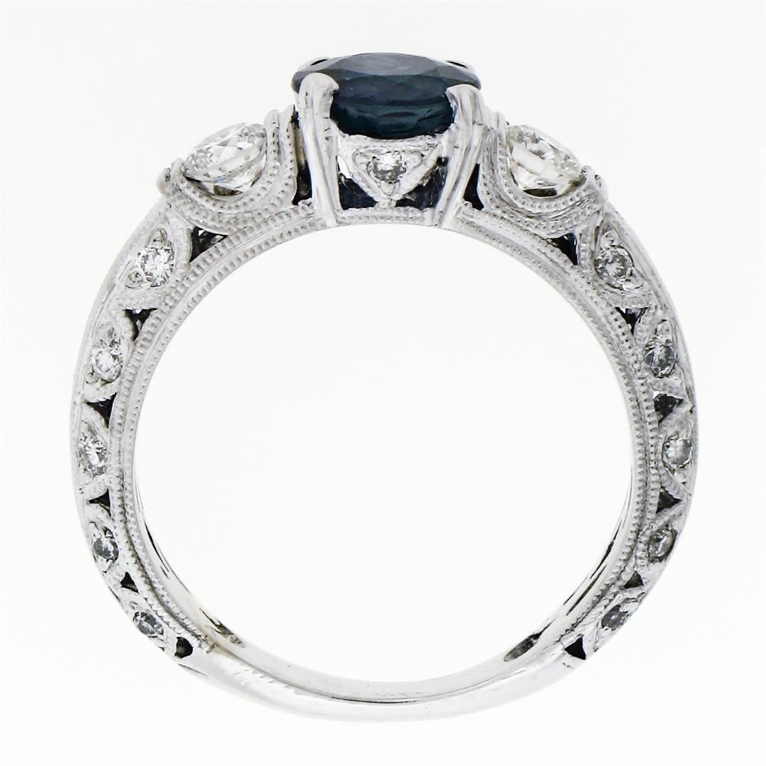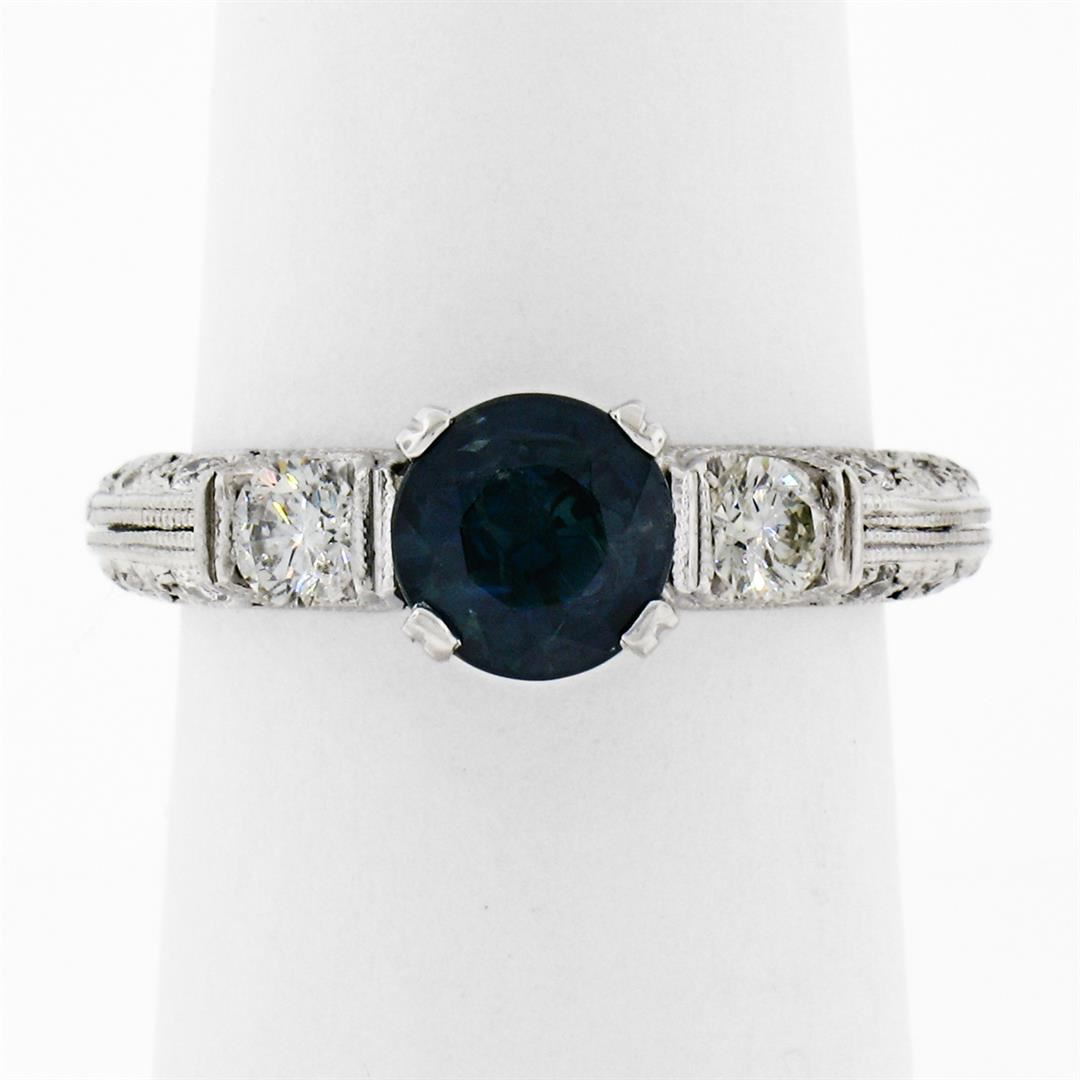 An estate solid 14k white gold solitaire engagement ring, featuring 1 round brilliant cut natural sapphire (6.40mm-1.08ct), and 24 round brilliant cut natural diamonds ( F/G- VS1/VS2/SI1; 0.52ctw). The ring is size 6.0, weighs a total o f4.50 grams, and measures 6.40mm wide.