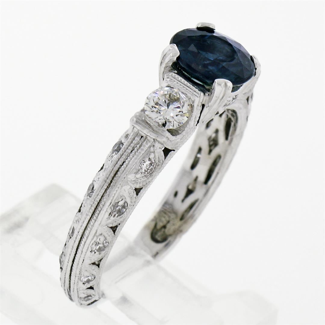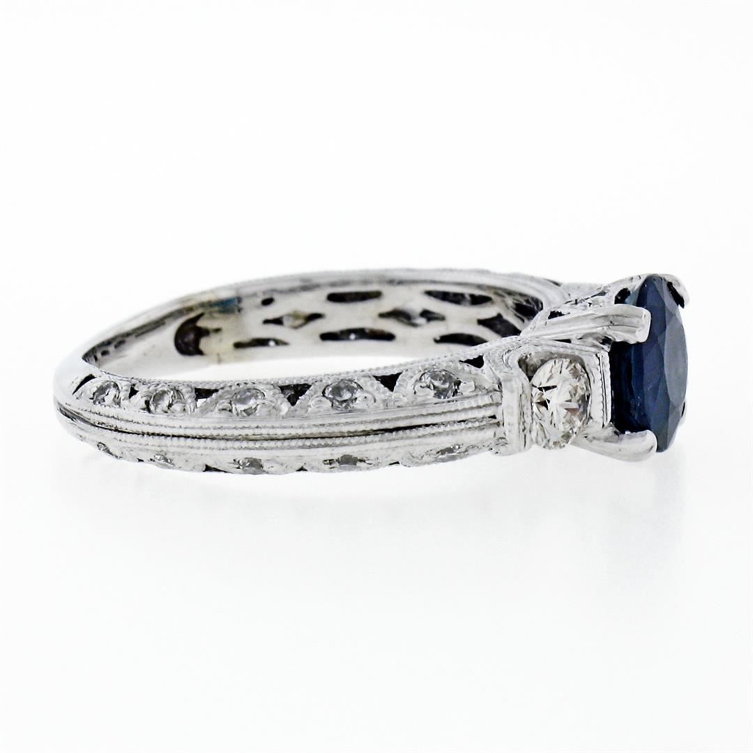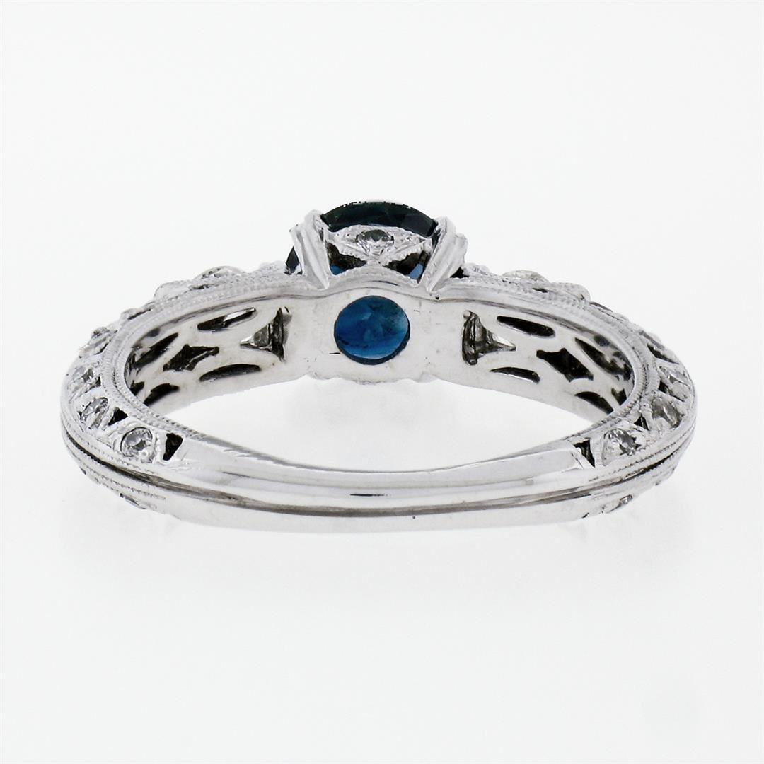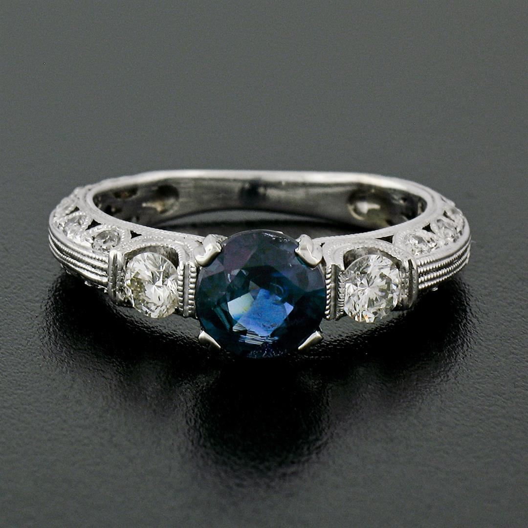 An estate solid 14k white gold solitaire engagement ring, featuring 1 round brilliant cut natural sapphire (6.40mm-1.08ct), and 24 round brilliant cut natural diamonds ( F/G- VS1/VS2/SI1; 0.52ctw). The ring is size 6.0, weighs a total o f4.50 grams, and measures 6.40mm wide.