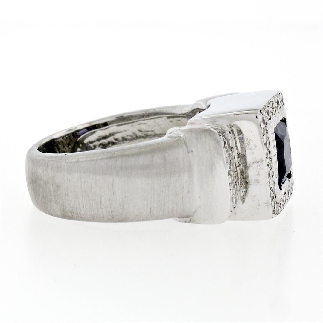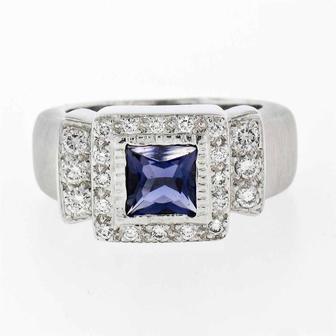 An estate solid 14k white gold ring, with 1 princess cut natural Iolite (1.15ct), and 22 round brilliant cut natural diamonds (F/G - VS1/VS2; 0.50ctw). The ring is size 5.5, weighs a total of 9.30 grams, and measures 10.25mm wide.