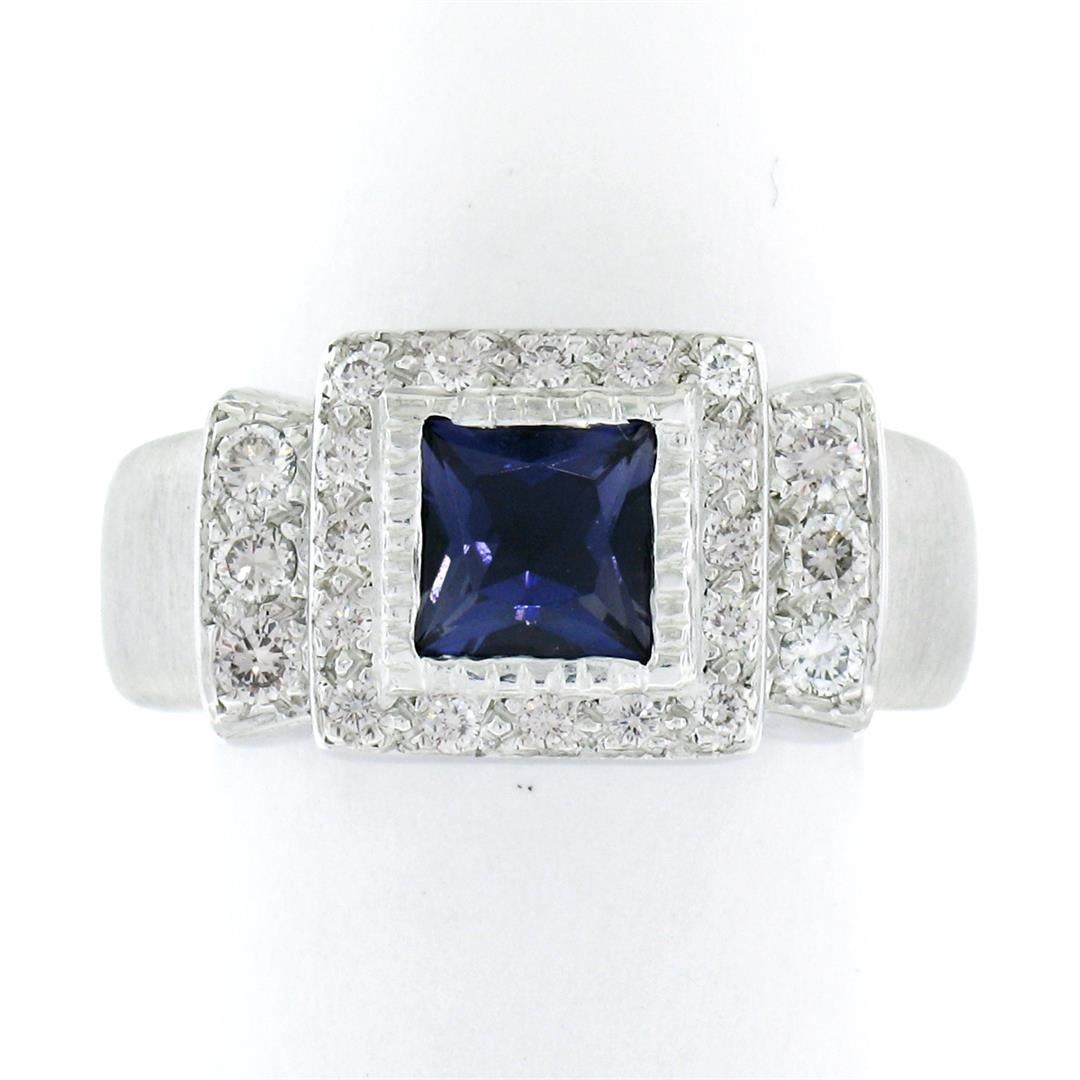 An estate solid 14k white gold ring, with 1 princess cut natural Iolite (1.15ct), and 22 round brilliant cut natural diamonds (F/G - VS1/VS2; 0.50ctw). The ring is size 5.5, weighs a total of 9.30 grams, and measures 10.25mm wide.