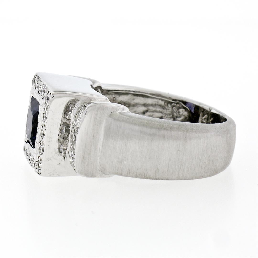 An estate solid 14k white gold ring, with 1 princess cut natural Iolite (1.15ct), and 22 round brilliant cut natural diamonds (F/G - VS1/VS2; 0.50ctw). The ring is size 5.5, weighs a total of 9.30 grams, and measures 10.25mm wide.
