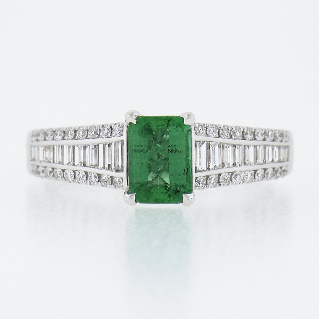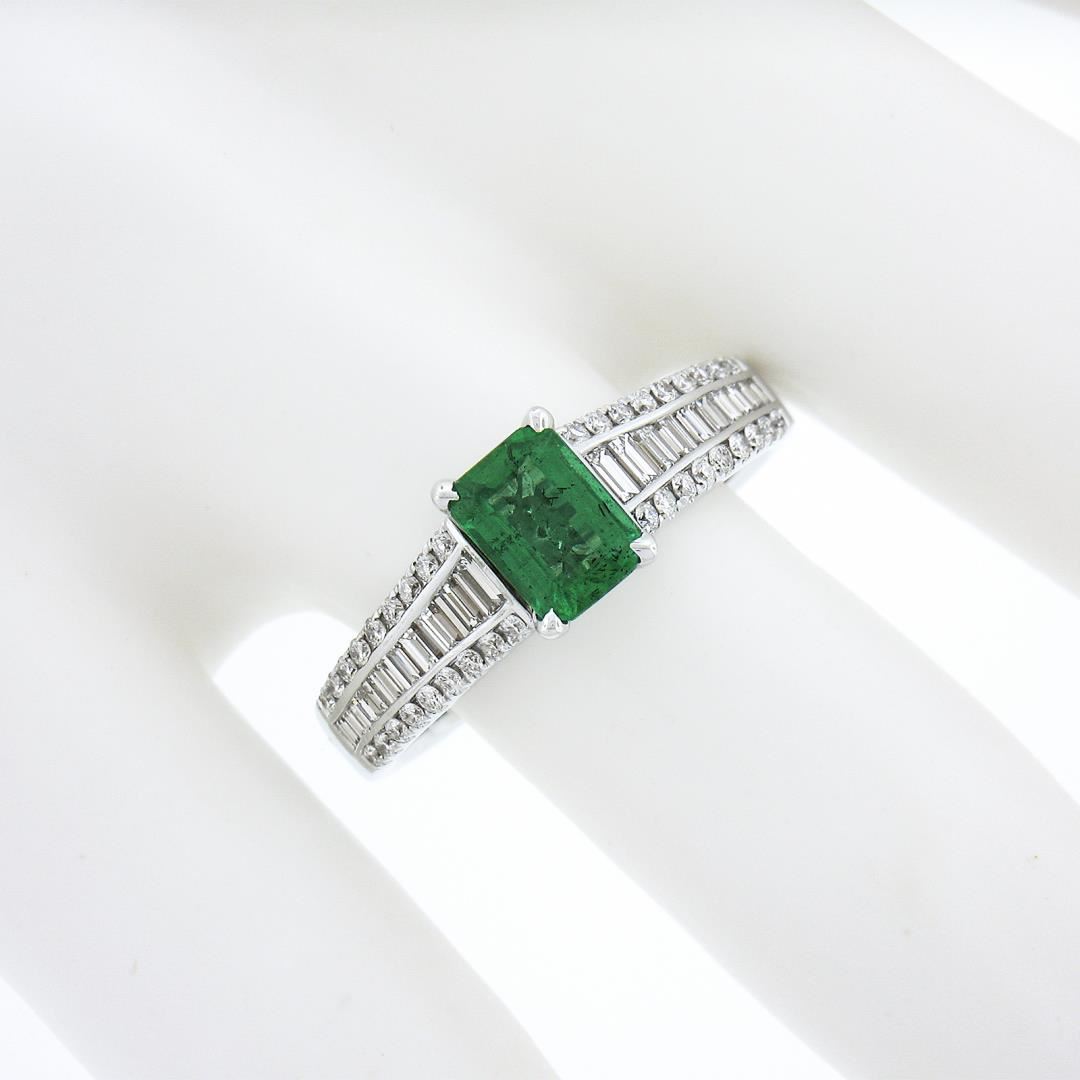 A solid 14k white gold ring, with 1 emerald cut natural emerald (0.75ct), and 20 baguette cut with 36 round brilliant cut natural diamonds (F/G - VS1/VS ; 0.96ctw). The ring is size 8.5, weighs a total of 4.59 grams, and measures 7.5mm wide.