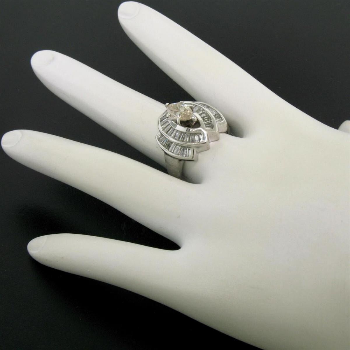 One 14K White Gold 1.74ctw Diamond Engagement Ring w/ Light Champagne Marquise Solitaire. Item Details: Material: 14K Solid White Gold, Weight: 6.6 Grams, Stone(s): (1) Natural Genuine Diamond - Marquise Cut - Prong Set - Light Champagne Color - I1 Clarity - 0.60 (exact), (38) Natural Genuine Diamonds - Baguette Cut - Channel Set - H/I Color - I1 Clarity - 1.14ctw (approx.), Total Carat Weight: 1.74 (approx.), Ring Size: 7.0 , Ring Width: 17.10mm, Ring Height: 9.15mm rise off the finger Condition: Like New!