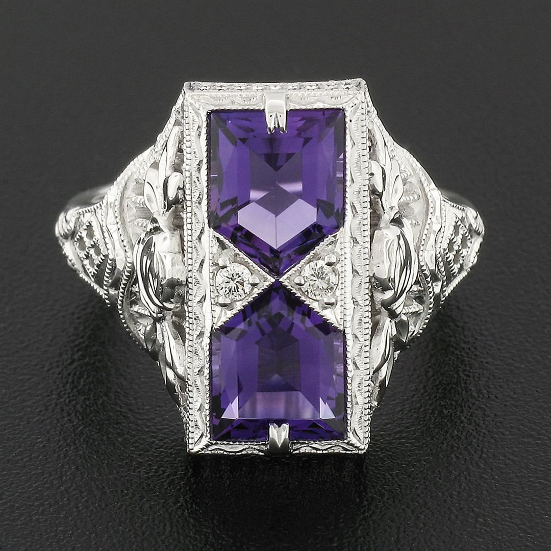 A new solid 14k white gold platter ring, with 2 custom cut natural amethysts (1.76ctw), & 2 round brilliant cut natural diamonds (G - VS2 ; 0.04ctw). The ring is size 6.5, weighs a total of 5.94 grams, and measures 17.2mm wide.