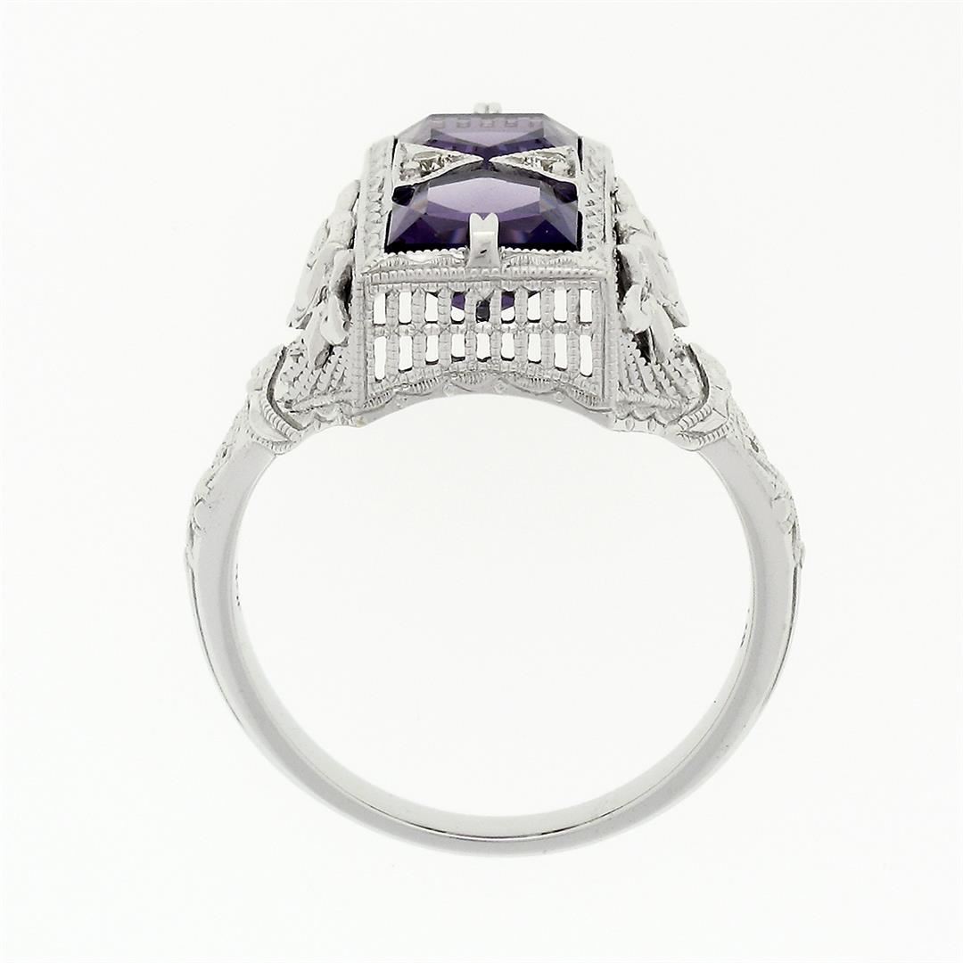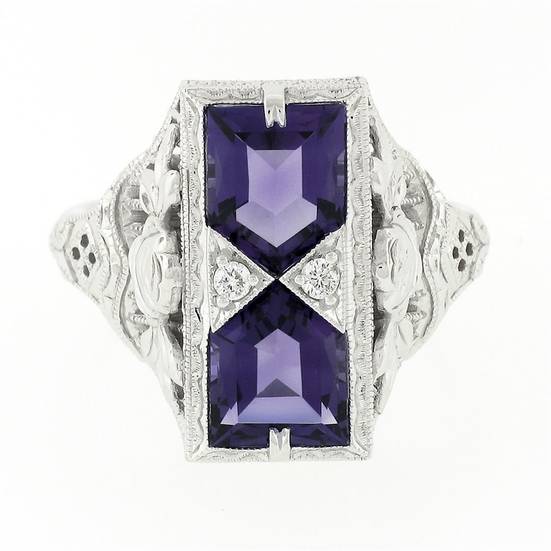 A new solid 14k white gold platter ring, with 2 custom cut natural amethysts (1.76ctw), & 2 round brilliant cut natural diamonds (G - VS2 ; 0.04ctw). The ring is size 6.5, weighs a total of 5.94 grams, and measures 17.2mm wide.