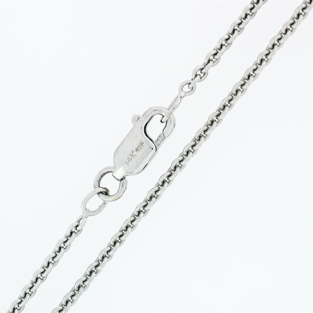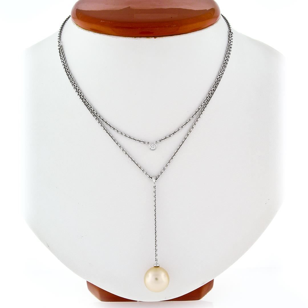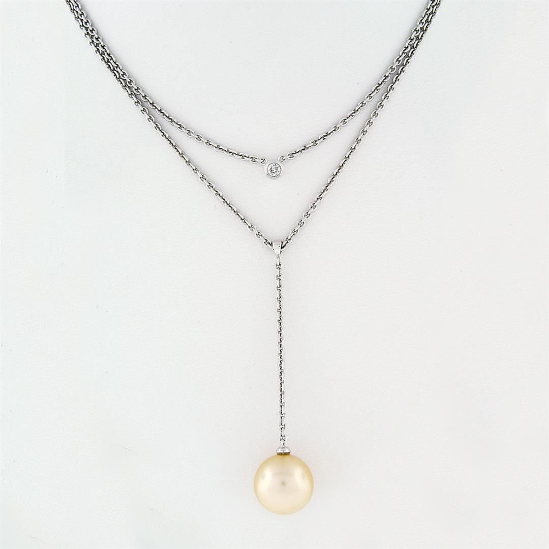 A solid 14k white gold layered dangle necklace with 1 round shape golden cultured pearl (12.0mm) and 1 round brilliant cut natural diamond (G - VS2; 0.08ct). 16 inch cable link chain, 9.67 grams total weight.