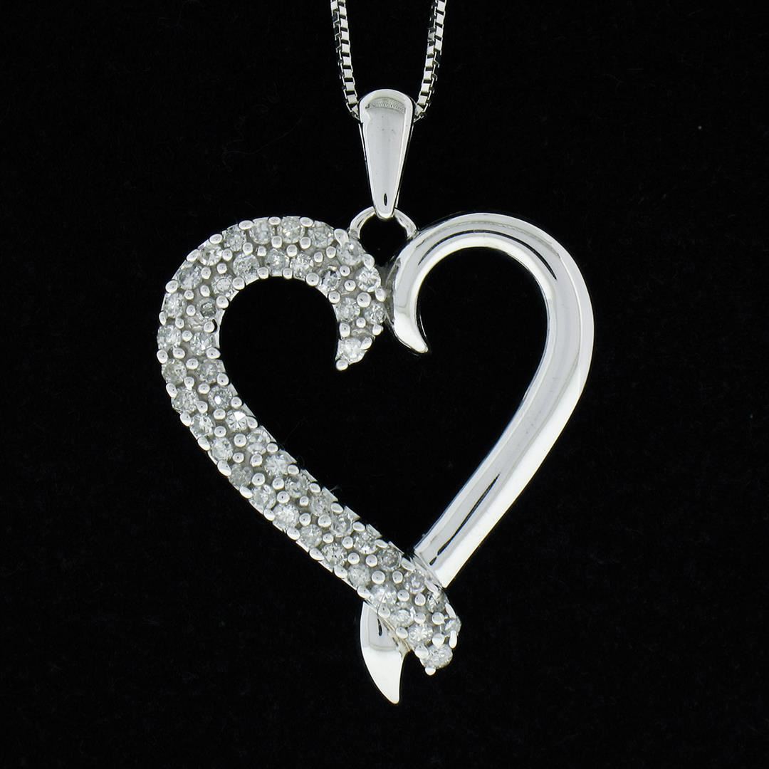 An estate solid 10k white gold heart pendant necklace, with 47 round single cut natural diamonds (H/I - SI2/I1; 0.38ctw). The pendant weighs a total of 2.73 grams, measures 27.25x19.40mm including the bail, and 14k white gold 16 inch fine box link chain.
