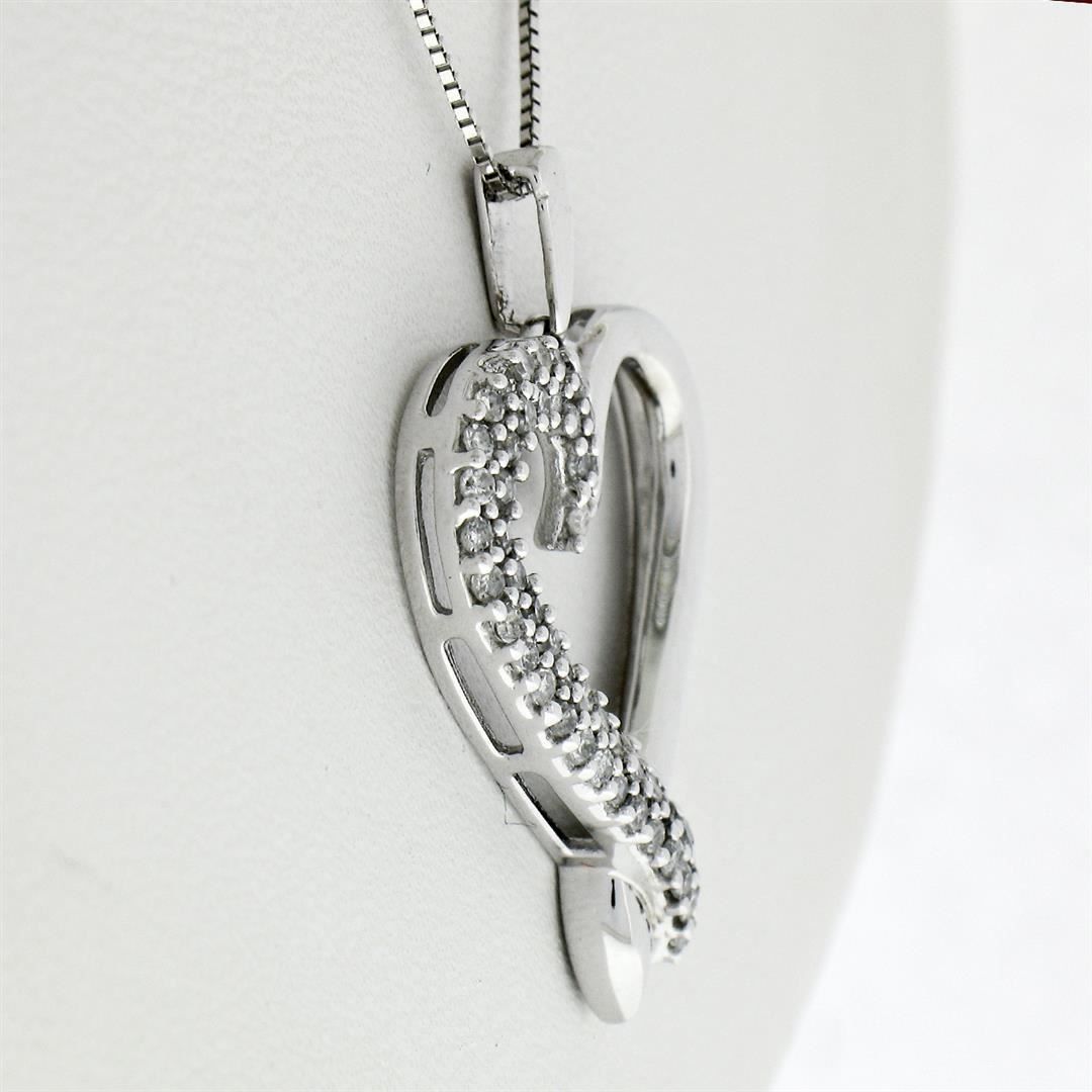An estate solid 10k white gold heart pendant necklace, with 47 round single cut natural diamonds (H/I - SI2/I1; 0.38ctw). The pendant weighs a total of 2.73 grams, measures 27.25x19.40mm including the bail, and 14k white gold 16 inch fine box link chain.