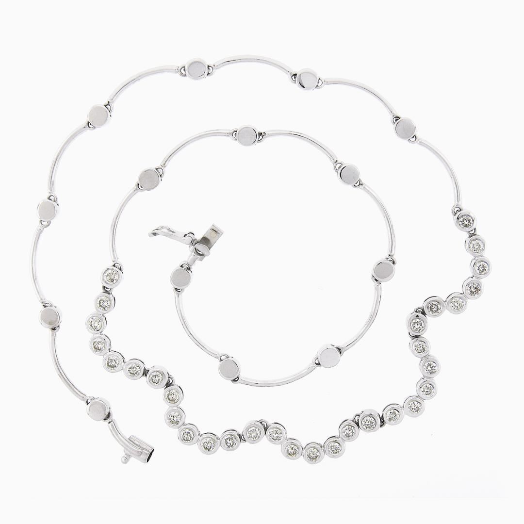 A solid 14k white gold wavy necklace, with 31 round brilliant cut natural diamonds (G/H- SI1/SI2; 2.50ctw). It weighs a total of 17.60 grams, measures 4.25mm wide, and measures 16.5 inches in length.