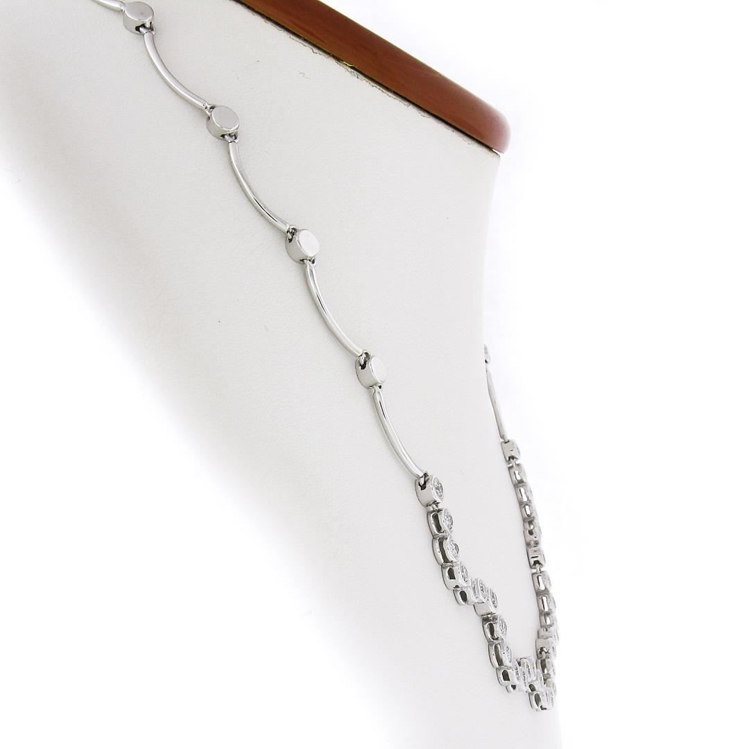 A solid 14k white gold wavy necklace, with 31 round brilliant cut natural diamonds (G/H- SI1/SI2; 2.50ctw). It weighs a total of 17.60 grams, measures 4.25mm wide, and measures 16.5 inches in length.