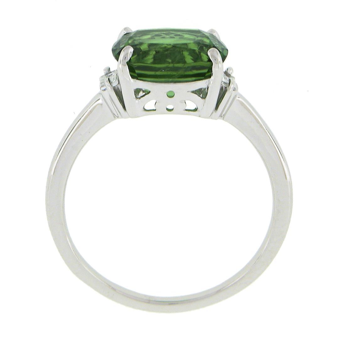 A solid 14k white gold ring, with 1 cushion cut natural tourmaline (2.88ct), accented with 2 baguette cut natural diamonds (G/H - VS2/SI1 ; 0.16ctw). The ring is size 6.5, weighs a total of 2.92 grams, and measures 8.3mm wide.