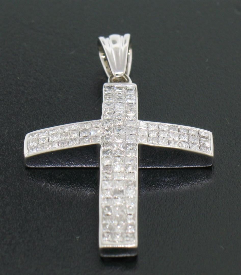 One Unisex 14K White Gold 3.25ctw Arched Invisible Set Princess Cut Diamond Cross. Item Details: Material: 14K Solid White Gold, Weight: 6.50 Grams, Stone: (108) Natural Genuine Diamonds - Princess Cut - Invisible Set - G/H Color - SI1 Clarity - 3.25ctw (approx.), Width: 25.91mm, Height (w/o Bail): 37.78mm, Height (w/ Bail): 47.74mm, Thickness: 4.69mm, Chain: Not Included. Condition: Like New