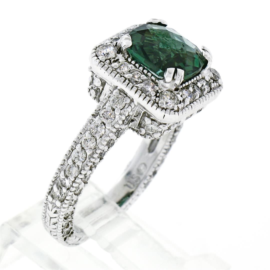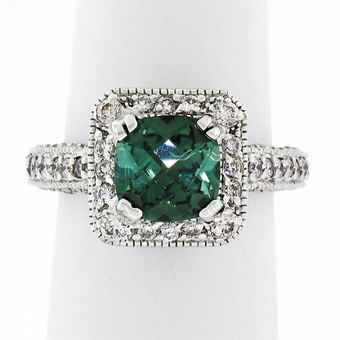 An estate solid 14k white gold solitaire ring, with 1 cushion checkerboard cut natural tourmaline (8.15x8.15mm - 2.25ct), and 90 round brilliant cut natural diamonds (G/H- VS1/VS2; 0.40ctw).The ring is size 7.0, weighs a total of 9.07 grams, and measures 12.30mm wide.