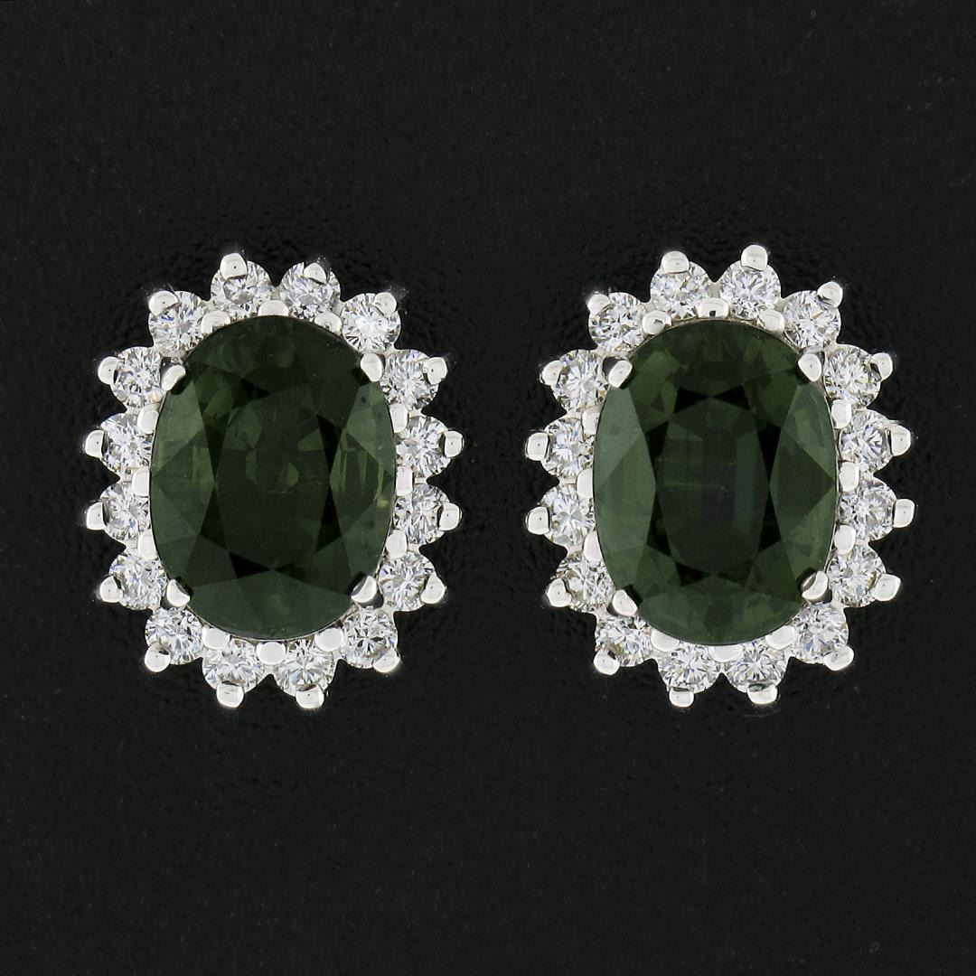 A solid 14k white gold stud earrings, with 2 oval cut natural green sapphires (8.15x6.15mm / 3.50ctw), surrounded with a halo of 32 round brilliant cut natural diamonds (G/H - VS1/VS2 ; 0.48ctw ). The earrings measure approximately 12.1x10.2mm and weigh a total of 4.96 grams.