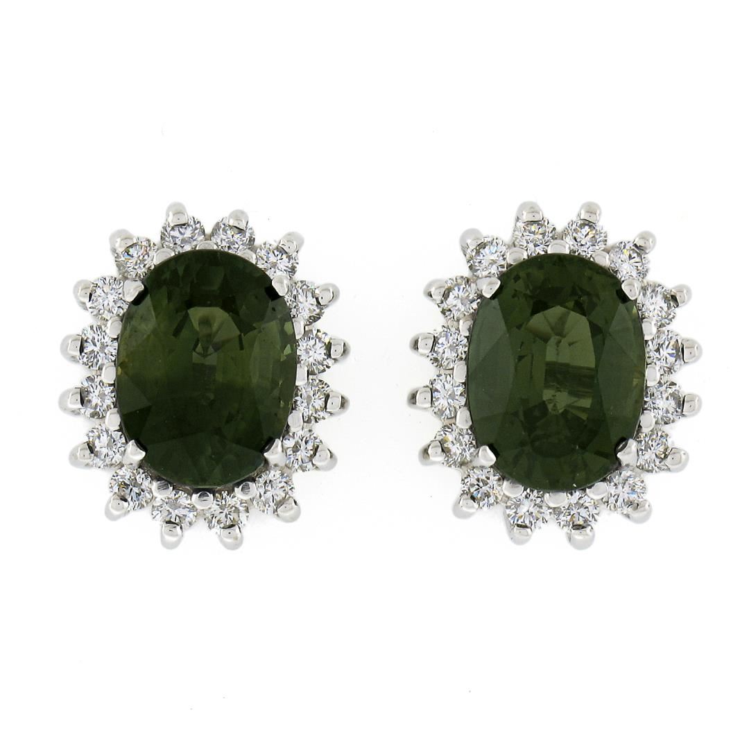 A solid 14k white gold stud earrings, with 2 oval cut natural green sapphires (8.15x6.15mm / 3.50ctw), surrounded with a halo of 32 round brilliant cut natural diamonds (G/H - VS1/VS2 ; 0.48ctw ). The earrings measure approximately 12.1x10.2mm and weigh a total of 4.96 grams.