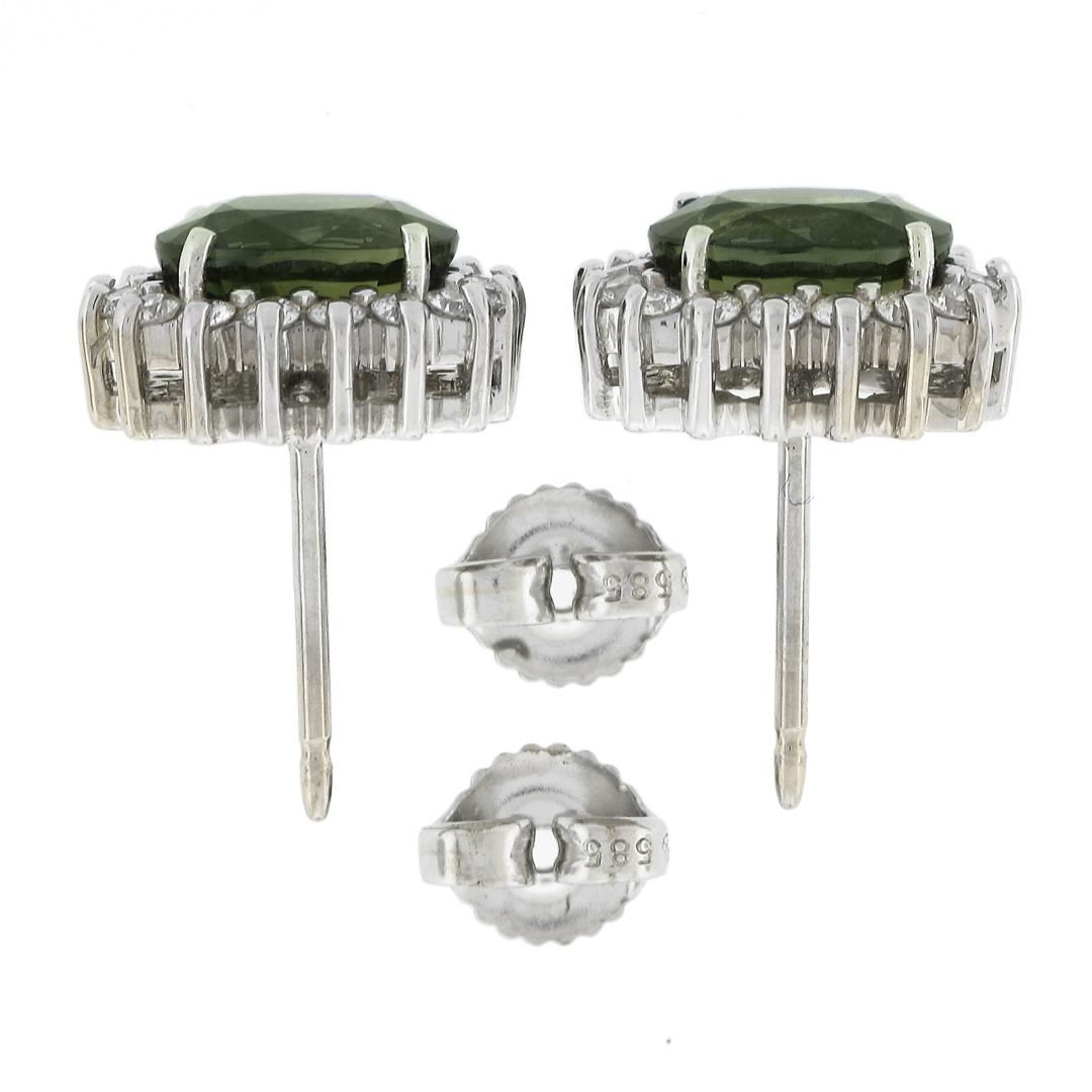 A solid 14k white gold stud earrings, with 2 oval cut natural green sapphires (8.15x6.15mm / 3.50ctw), surrounded with a halo of 32 round brilliant cut natural diamonds (G/H - VS1/VS2 ; 0.48ctw ). The earrings measure approximately 12.1x10.2mm and weigh a total of 4.96 grams.