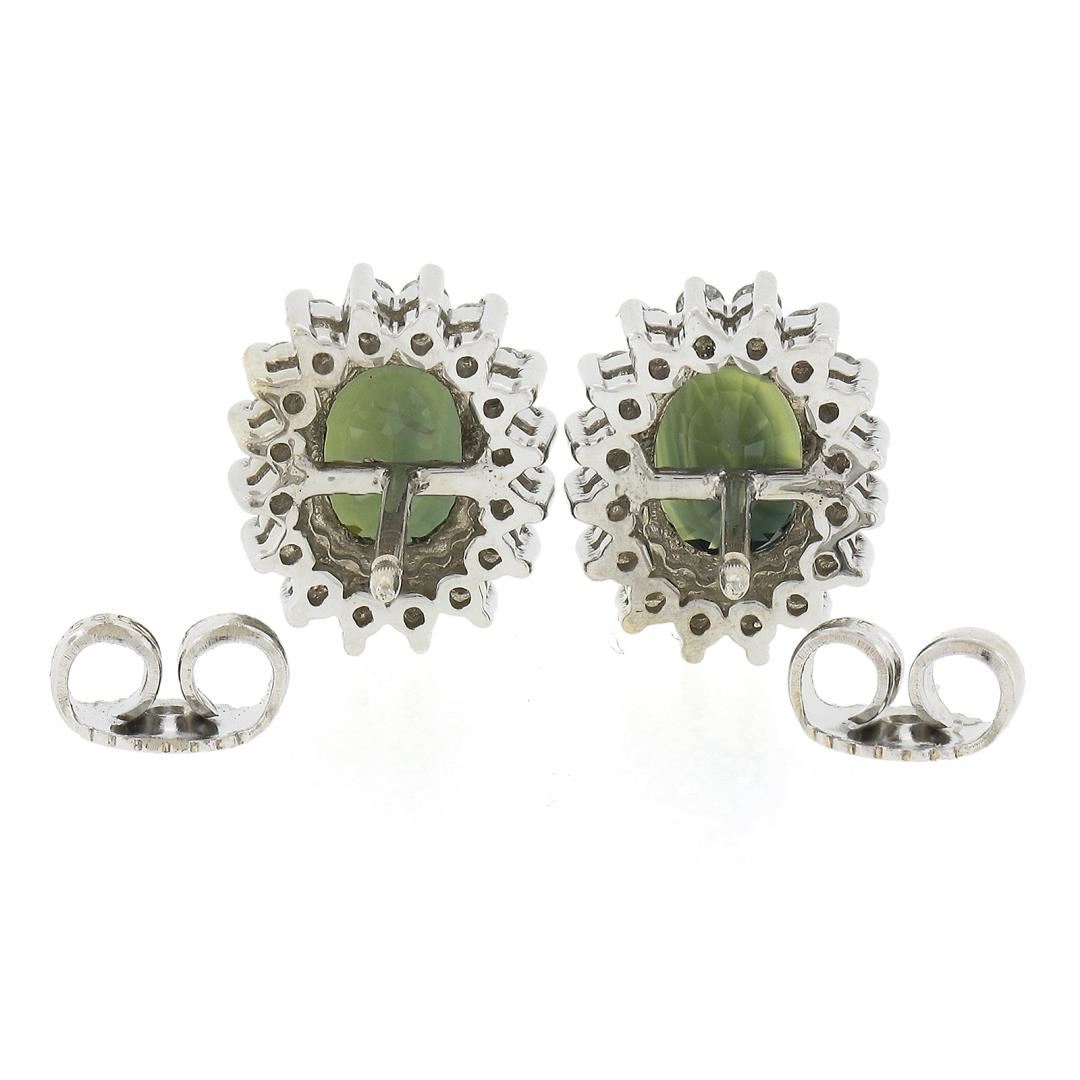 A solid 14k white gold stud earrings, with 2 oval cut natural green sapphires (8.15x6.15mm / 3.50ctw), surrounded with a halo of 32 round brilliant cut natural diamonds (G/H - VS1/VS2 ; 0.48ctw ). The earrings measure approximately 12.1x10.2mm and weigh a total of 4.96 grams.