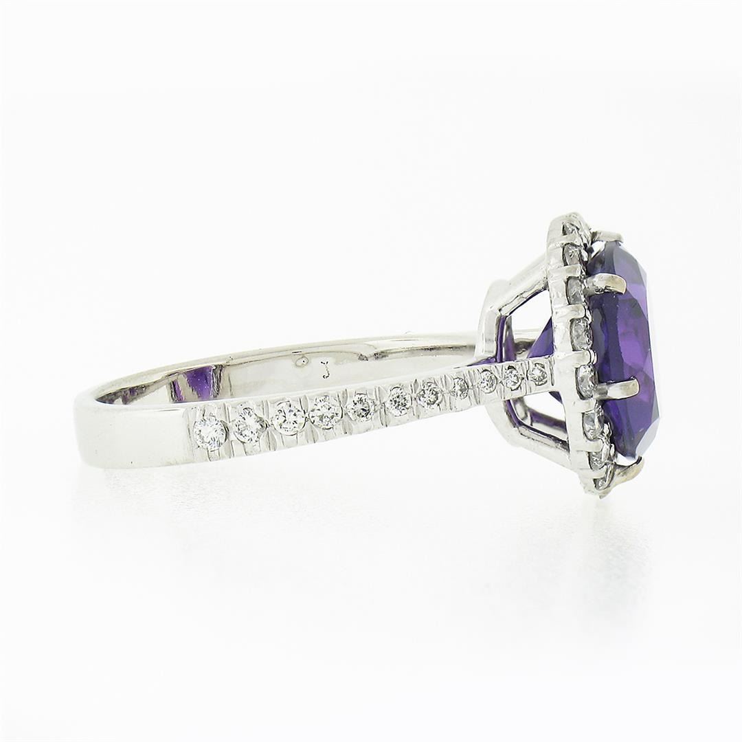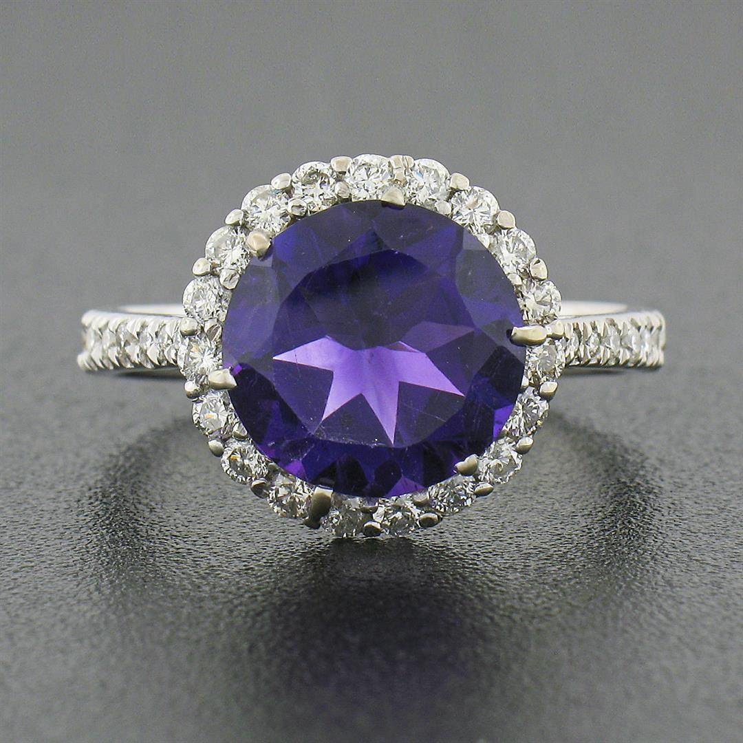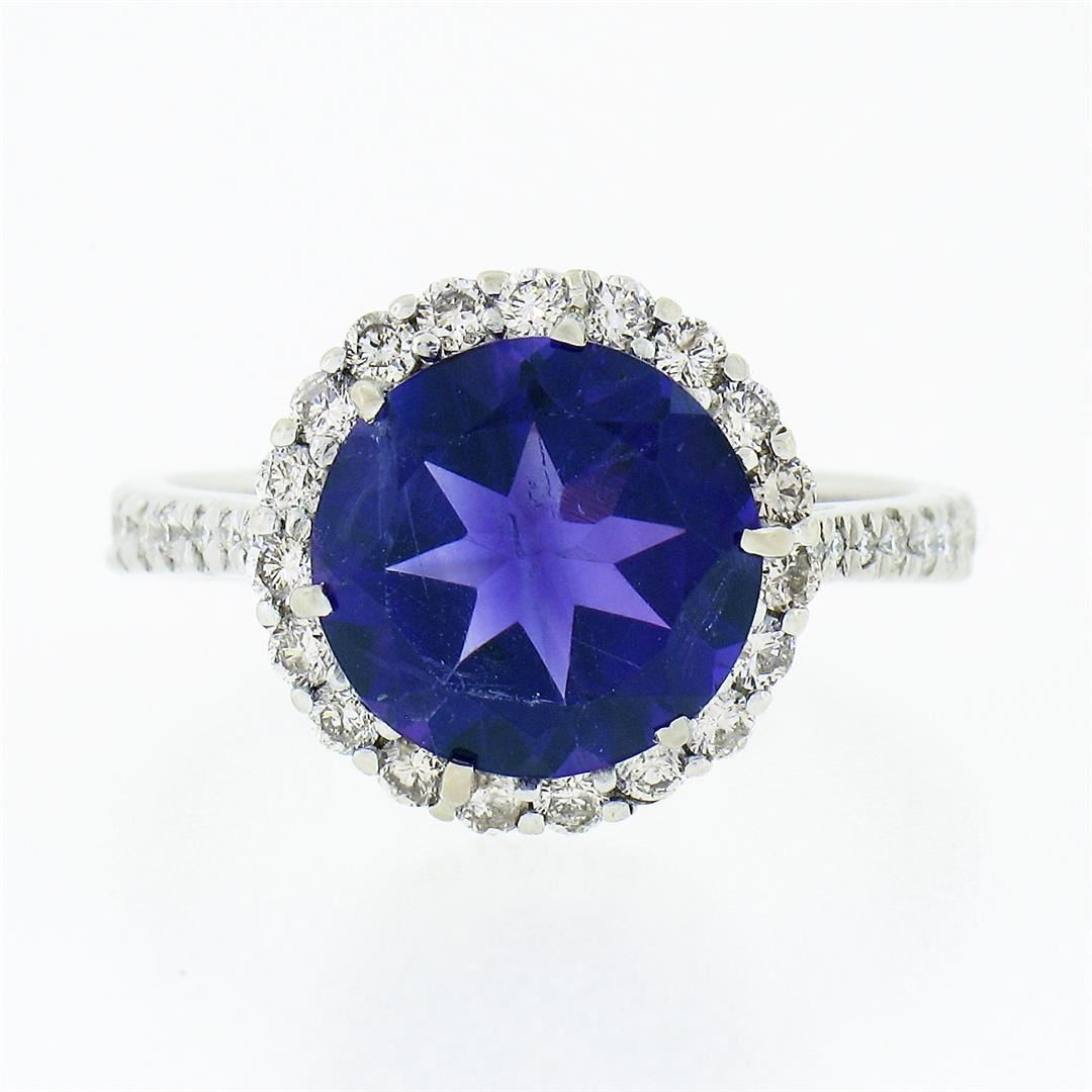 A solid 14k white gold ring, with 1 round brilliant cut natural amethyst (10mm - 3.3ct), surrounded with a halo of 39 round brilliant cut natural diamonds (G/H - VS2 ; 0.80ctw).The ring is size 7.5, weighs a total of 3.84 grams, and measures 12.85mm wide.